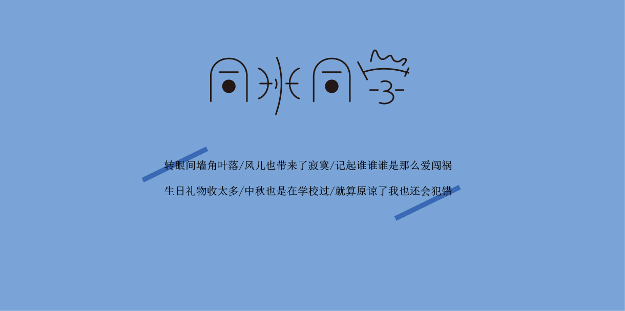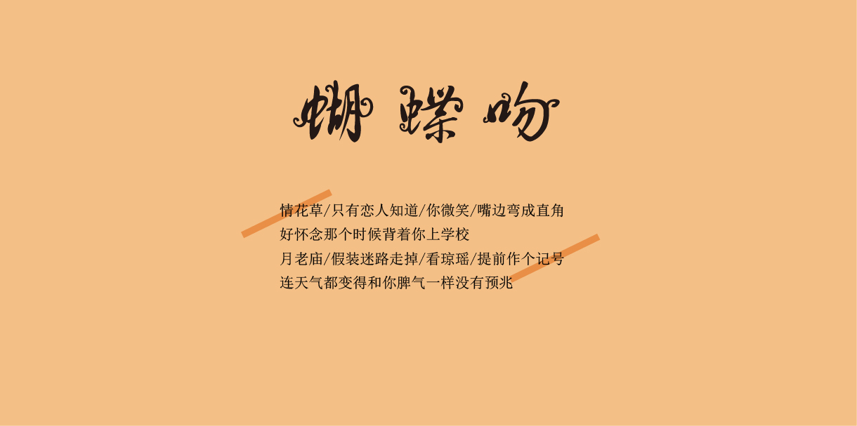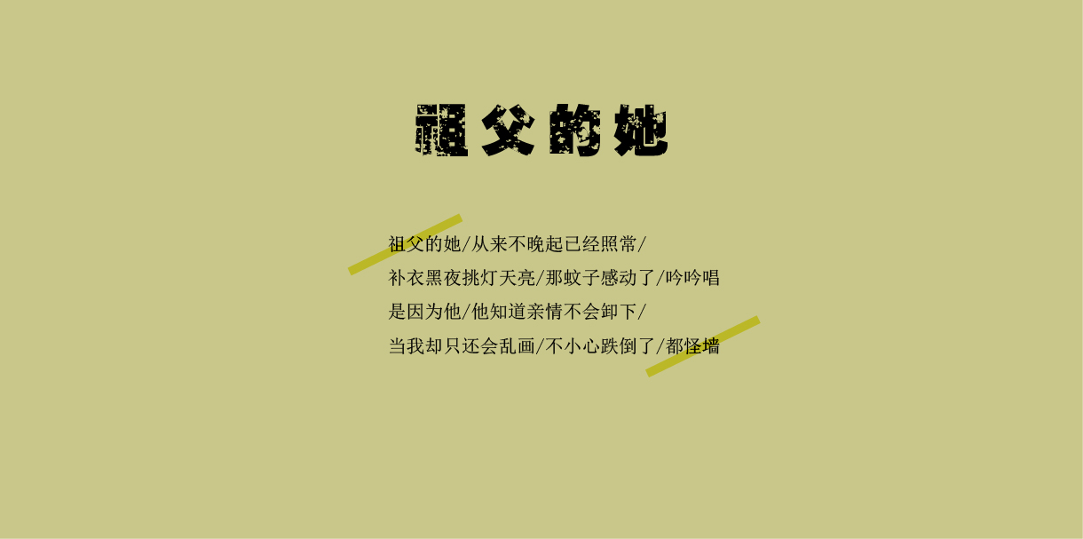 【短评】字体设计有点斑驳的感觉,描写的是祖父的她,我不知道这个祖父和祖父的她怎么去写,因为儿时特别调皮,还小的时候只是把爷爷奶奶当做欺负的对象,后来长大一点懂事了,可是他们却都已经不在了,导致我现在回忆他们都很吃力,只能记得依稀的画面和片段,写这首歌的时候,我特别喜欢的就是这句:不小心跌倒了/都怪墙,相信大家也深有体会,儿时的我们跌掉了,疼爱我们的长辈都是在说不哭不哭,你看是这地不平,是都怪这个石头等等之类的,就感觉恍如昨日啊。