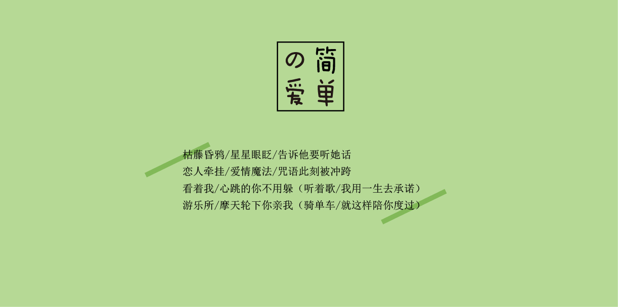 【短评】受日式设计的影响,觉得“的”一定要写成“の”,本来就是写简简单单的东西,就用了最简单的方式做字,歌词内容在写的时候还在哼唱着周杰伦的简单爱,里面的一些韵脚都是用的相同的词根。