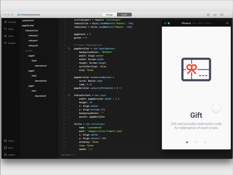话说设计师,应该做到更完美. 那么我们就针对当前的动画来做一个可交互的引导页原型; 这部分比较难了哦,需要有一定代码基础,因为我使用的动效原型工具是 **framer**, 因为他可实现最为接近原生的交互效果, 支持多台预览, 我在试用了大量市面上的交互软件后,决定使用它(然后就是AE和principle这三款,其余都没有什么太好用的)