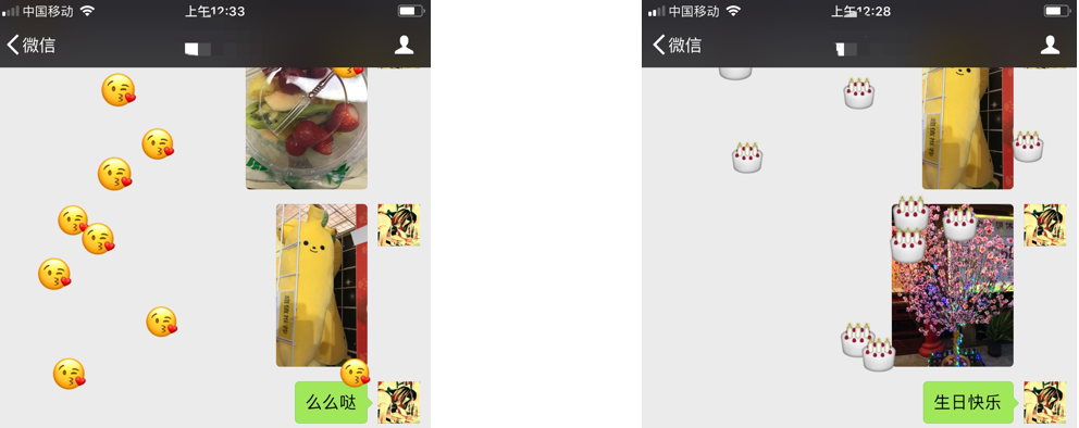 在微信打聊天界面中,我们输入关键词后背景出现图案特效制造惊喜,比如输入么么哒,出现可爱的小表情;输入“生日快乐”,出现跳跃的蛋糕图形,营造浪漫温馨的氛围,提高用户的幸福感。