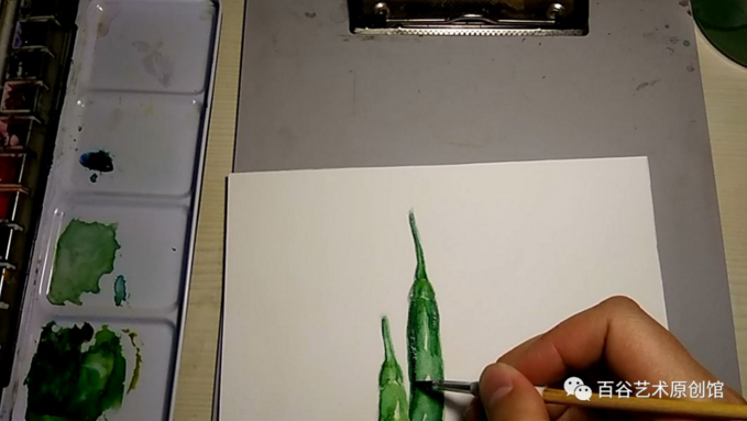 在作品的某些部位,有时候为了做出一些效果,需要保持画面湿润,这时候可以准备一支自来水管笔(就是下图手中的这种笔,笔干的部分可以盛水,在画笔干的时候可以稍微捏一下,它就会自然下水),小范围的把要上色的部位刷上一层水,然后再用其它画笔调和上颜色在辣椒上上色。