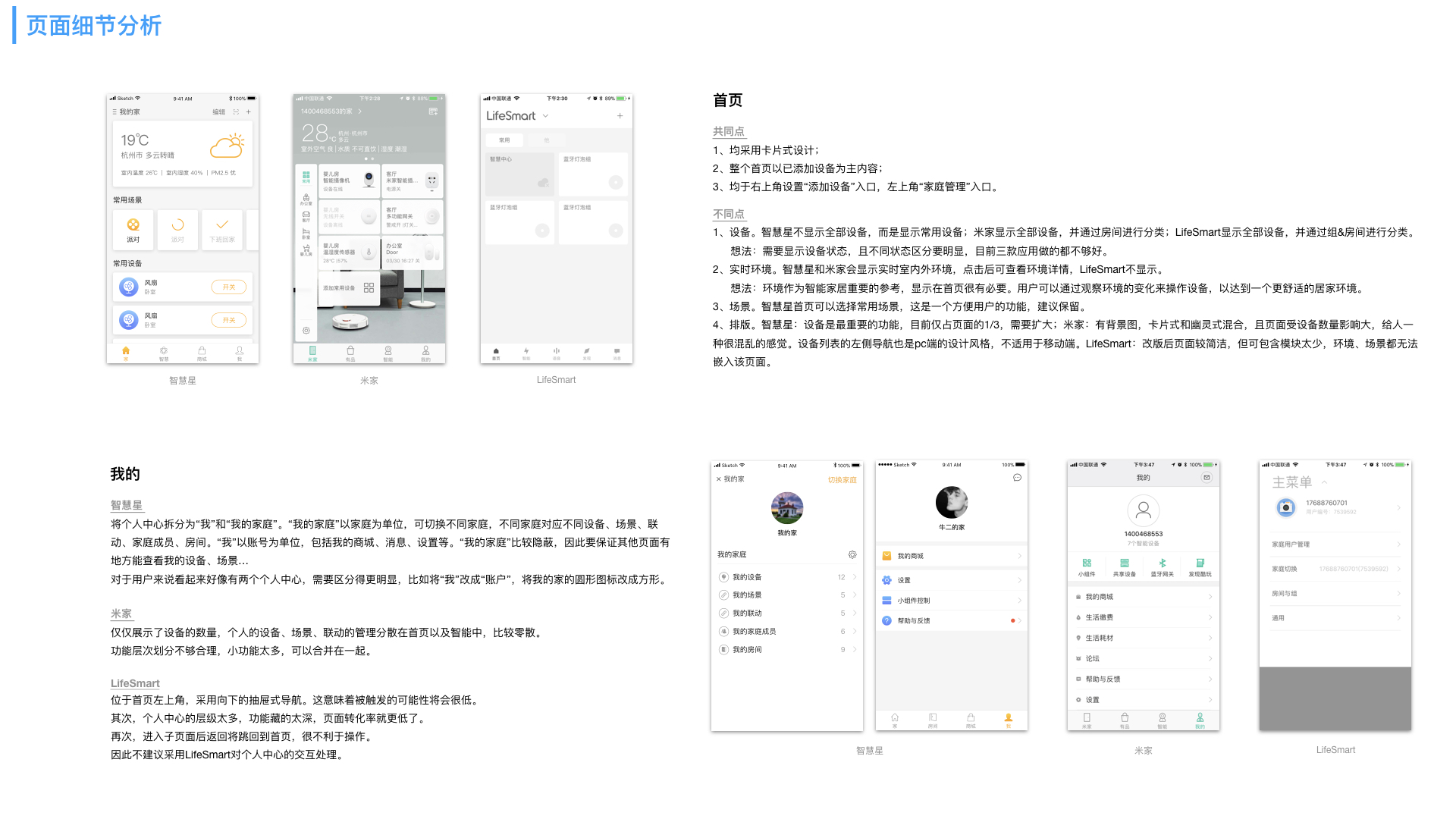 前几步是结构框架层的分析,这一步开始落地于页面分析。每个产品的页面都很多,所以抓住主要页面分析即可。最主要最直观的就是标签栏的功能页,而首页和个人中心则是重中之重。分析时要从不同方面罗列竞品的相同点和不同点,比如排版、页面风格、动效等等。不同产品的页面细节差异很大,这里不做深入探讨,实际工作中请结合每个产品的特色进行分析。