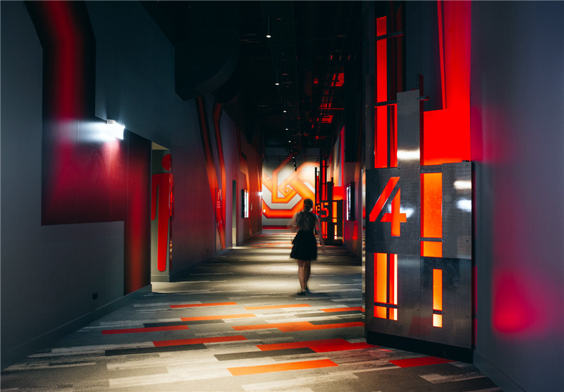 设计师采用大胆的环境图形设计,观影区域醒目且直观的橙色标识系统,灯箱与墙面涂鸦相结合营造出活力氛围。大厅的设计则较为简约,注重实用性,以直接涂绘在墙面的黑白撞色标识融入环境中。以不同的表现形式为观众带来富有变化而毫不张扬的视觉体验。