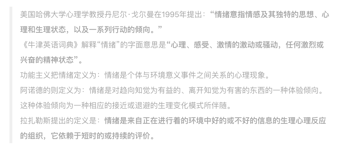 心理学上对情绪的定义是:对一系列主观认知经验的通称,是多种感觉、思想和行为综合产生的心理和生理状态。