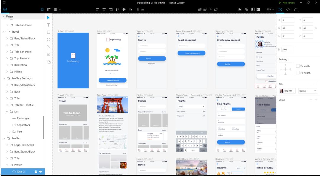 双击Sketch文件,这就是打开的样子。Artboard被保存的非常好,另外右侧的图层和组也很完整的呈现出来,对了,还有pages等等内容也保留的很好,更让我感到惊讶的,比如头像区域的填充,也可以进行编辑操作。