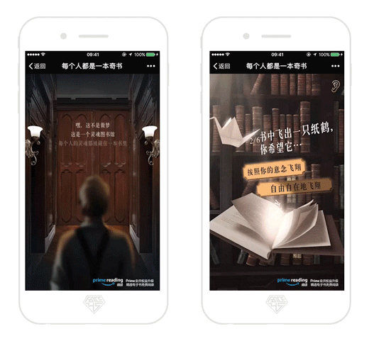 亚马逊推出的这款H5,以问答题为交互,行如流水的视觉特效将整个画面展现的非常完美。从全景的图书馆到某本书,用复古的形式将自己在图书馆找书的感觉表达出来。