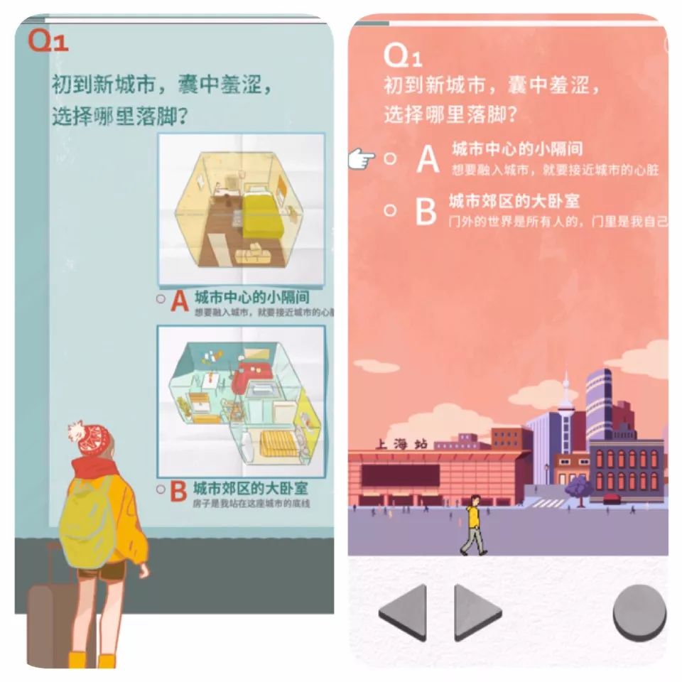 新世相联合优酷和《北京/上海女子图鉴》一起打造了一款H5用于宣传,抓住“逃离北上广”这个年轻人的痛点,以在大城市奋斗为主题,将测试与动画合二为一,内容及文案打动了不少在异乡漂泊人的心。