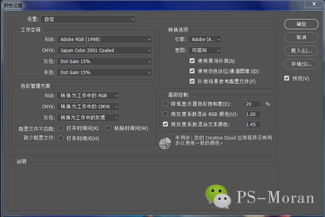 1.2对于可以设置颜色的软件(Ps,Ai,Id,CDR),我们采用相同的色彩管理方式——把软件的工作空间设置一样(参考下图),同时色彩管理方案设置为转换为工作中的配置(参考下图)