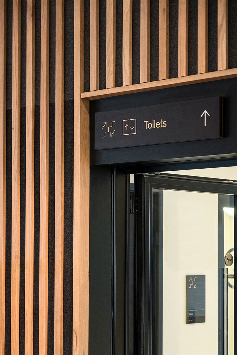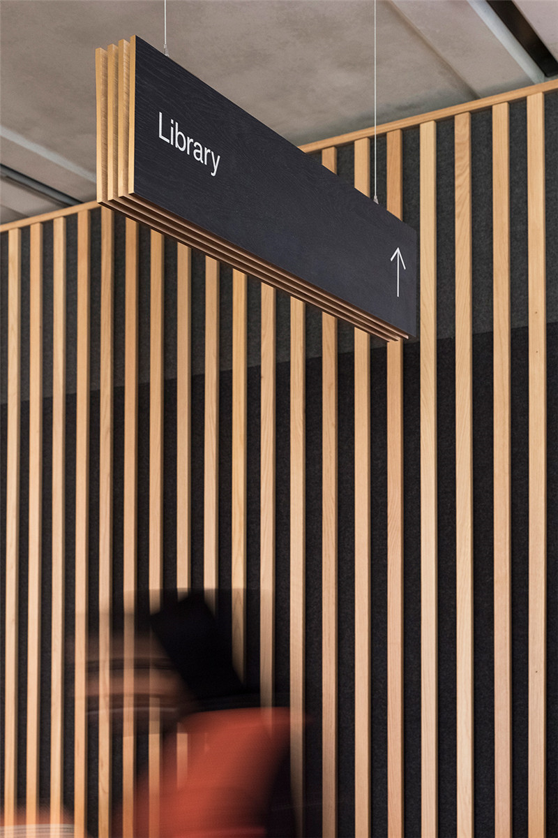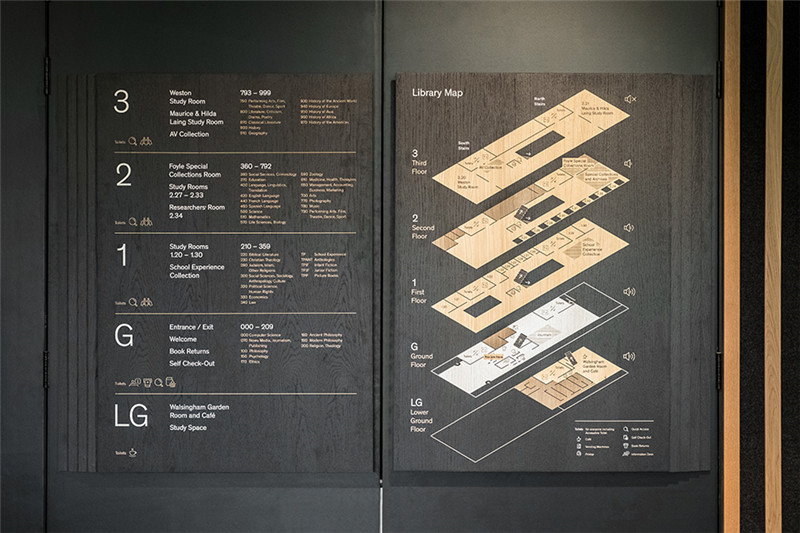 设计灵感来源于优雅、时尚和迷人的奥黛丽赫本,一个精致且美丽的角色。标牌图形引用这种简单时尚的方法,而关键方向标牌的材料分层形式与历史书籍的镀金边缘以及图书馆和学习的悠久传统相呼应。图书馆内清晰易懂的的定位图和位置标牌,能够让每个人很好的了解空间特性,发挥高效的指引功能,更为空间添加引人入胜的亮点。