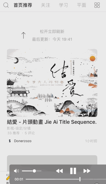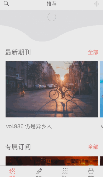 站酷App下拉刷新显示的是最近刷新时间,不是每一个App都会有这种操作效果,非要说这种显示有啥优点的话,那大概就是为了让用户安心,少刷吧。个人不是很喜欢这种方式,有一丢丢寡淡,没啥意思,但就是仅仅作为一个提示的话还是可以的,但是你要是想让你的App追求极致的视觉体验的话,还是再优化一下比较好。后来我就想找找有没有更好的,然后发现下面的落网App,它的下拉刷新是一种很奇妙的感觉,整个下拉刷新的效果是会随着你手动操作来变化的,而且曲线的最低点恰好是在你手指按压的垂直方向上,很神奇有没有!