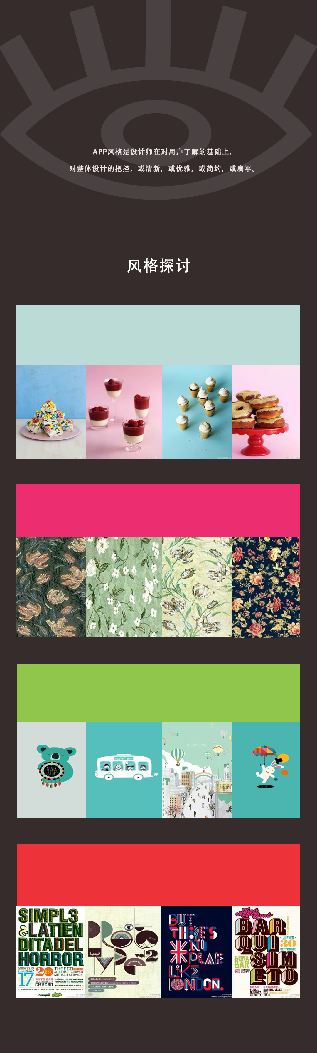 在自己以前收集的风格图片里挑着挑着就挑花了眼,所谓的审美疲劳,所谓的技艺不熟,所谓的半路出家,总归是没有一个系统的框架来指导我如何用科学的方法进行设计,总觉得自己跟大神有一定的区别,野路子总是要付出更多的,以下是挑选的几种可以试用的风格。