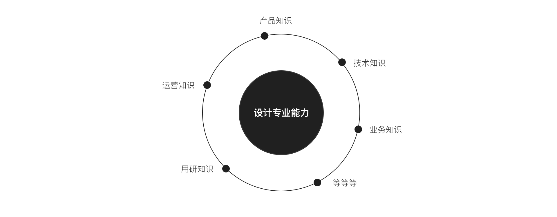 设计师的知识框图核心为设计专业能力,其他为辅助能力(包含产品知识、技术知识、用研知识、业务知识、运营知识等涉及到的所有知识)