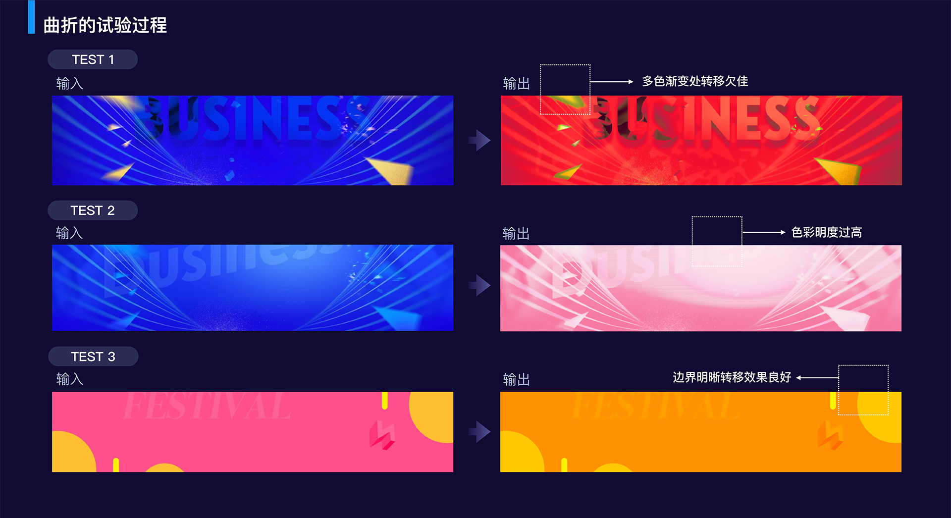 与色彩转移的创新结合有两个核心关键点,一是设计与技术产生碰撞后的融合,我们在色彩转移试验过程中,结果并非一直如设计师所预期,首先技术会有暂时的局限性,例如转移结果遇到的多色渐变处转移欠佳,衔接不自然或包含诸多杂色,设计师常用的动感模糊及高斯模糊等手段可能受限,则需要迎合技术去做一些设计优化及丰富性的取舍;其次机器是缺乏认知理解能力,设计师需将想要实现的效果抽象成HSL配色规则,试验的过程往往也是反复曲折的,需要针对BADCASE进行分析,推断规则的问题点,对其进行优化,通过反复试验,最终使得生成结果达到上线标准;二是色彩转移过程与人工设计之间衔接与流程,我们采用是系统设计思维,将分会场元素拆解成简便的和可组合的形态,外包拿到色彩转移结果及其他元素仅需进行拼装组合,便可实现海量分会场设计的高效完成。