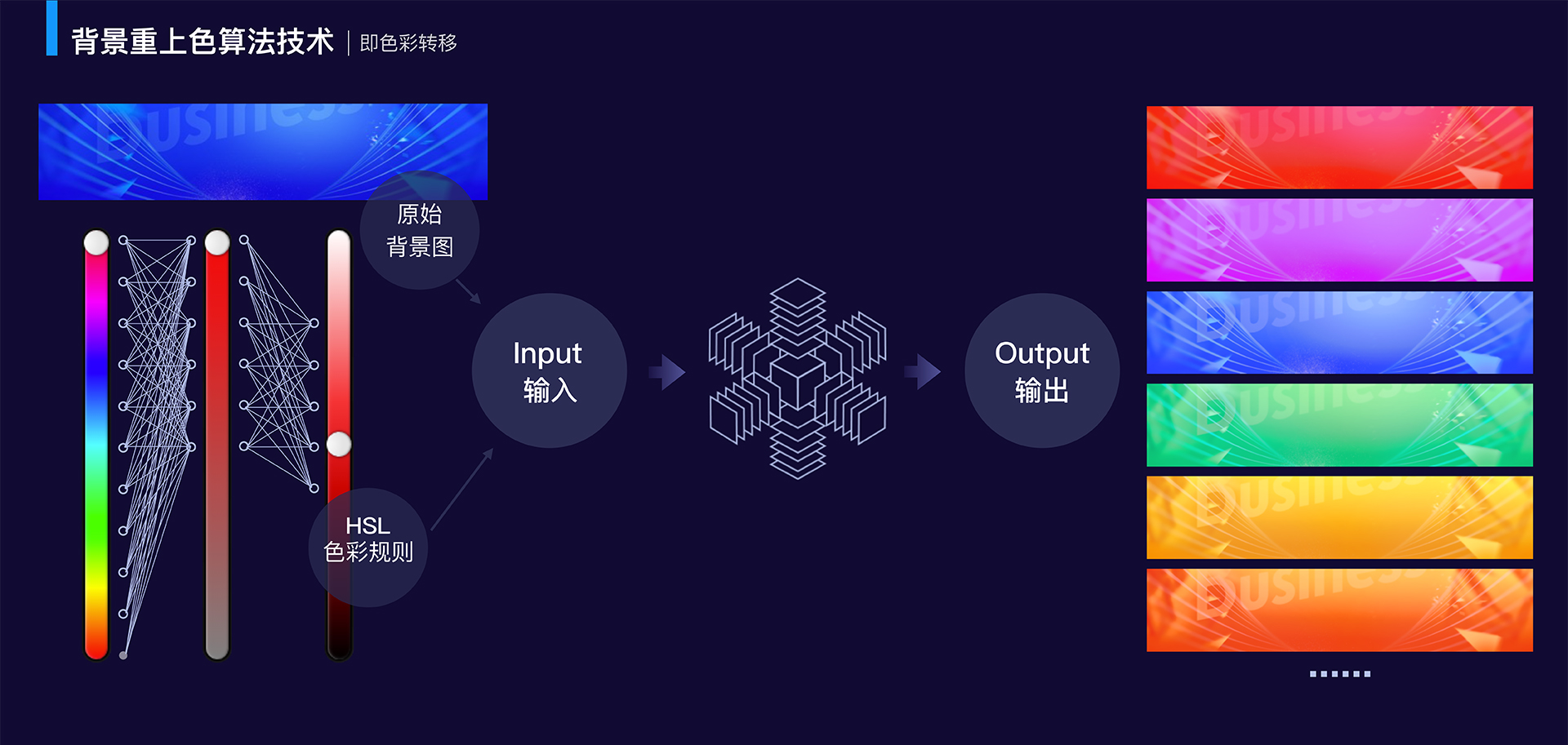 背景重上色算法技术(本文称之色彩转移),即输入背景图片,输入基于HSL色彩模型系列配色规则(包含区间组合方式、度数间隔等),以每0.5s输出一张结果的速度输出几百个背景配色(即几百种HSL颜色值对应的背景重上色结果)。比如背景的主体色是A,其中一种配色方案,想转移成主体色B,那么原背景中的每个像素的颜色都按照A色到B色相应的进行差值。HSL值规则越细,生成结果越多效果越丰富。