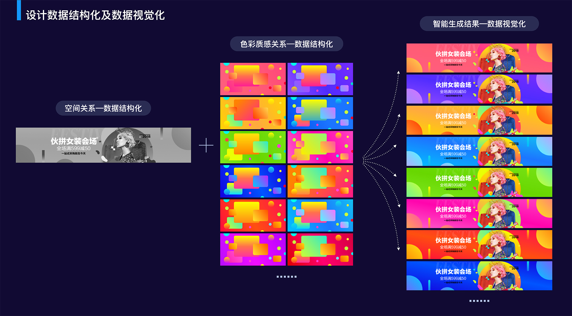 此前我们在页面及BANNER尺寸拓展方面做过的诸多探索,均能带来效率的提升,但大多数是断点的,我们希望鹿班可以帮助我们实现大促设计工作的线性串联,实现页面设计到尺寸拓展一站式在线智能生成,并借此机会往机器智能化创造方面再迈进一点点。机器智能生成效果基于原始数据的学习,因此原始数据的设计显得尤为重要。设计师需将设计进行结构化、特征量化,可分为两大部分,一部分是定位设计各元素的空间关系,其中包括文字、主体、标识、修饰、背景5大类元素,需要设计及定义各元素的大小、方向及形状;另一部分是定义设计各元素的色彩质感关系,其中包括色彩、纹理及质感,还需定义各色彩层的比例关系及色彩层之间的位置关系。有了较丰富的设计数据,再在鹿班设计师端进行模板上传,将视觉数据化的部分包括构图模型、配色模型、文案模型进行数据输入,进行智能生成,将数据视觉化,设计师再根据生成结果进行人工评测。
