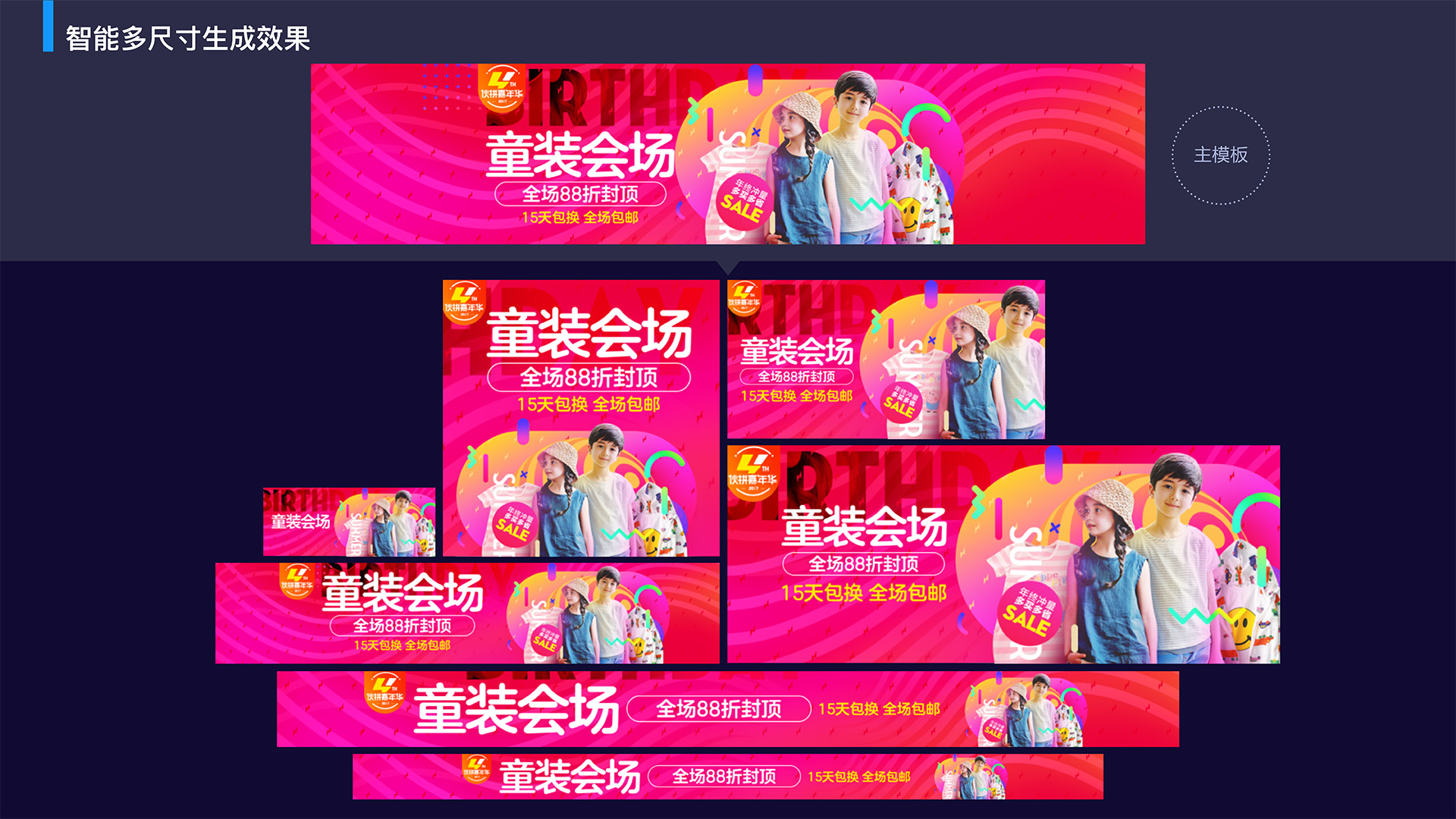 想要实现页面设计到尺寸拓展一站式生成,其最核心的是拓色及拓版打通这一关键技术难点,在和鹿班智能设计合作中,我们最终实现了大促页面设计到尺寸拓展一站式在线智能生成,并为大促定制了特有流程,进一步触碰智能图像时代。在此次CUB328商人节大促试点中,也有了很好的业务落地,一周内完成了近万张BANNER的智能生成,在确保内容丰富性的同时,大大提高了设计效率、节省设计费用。