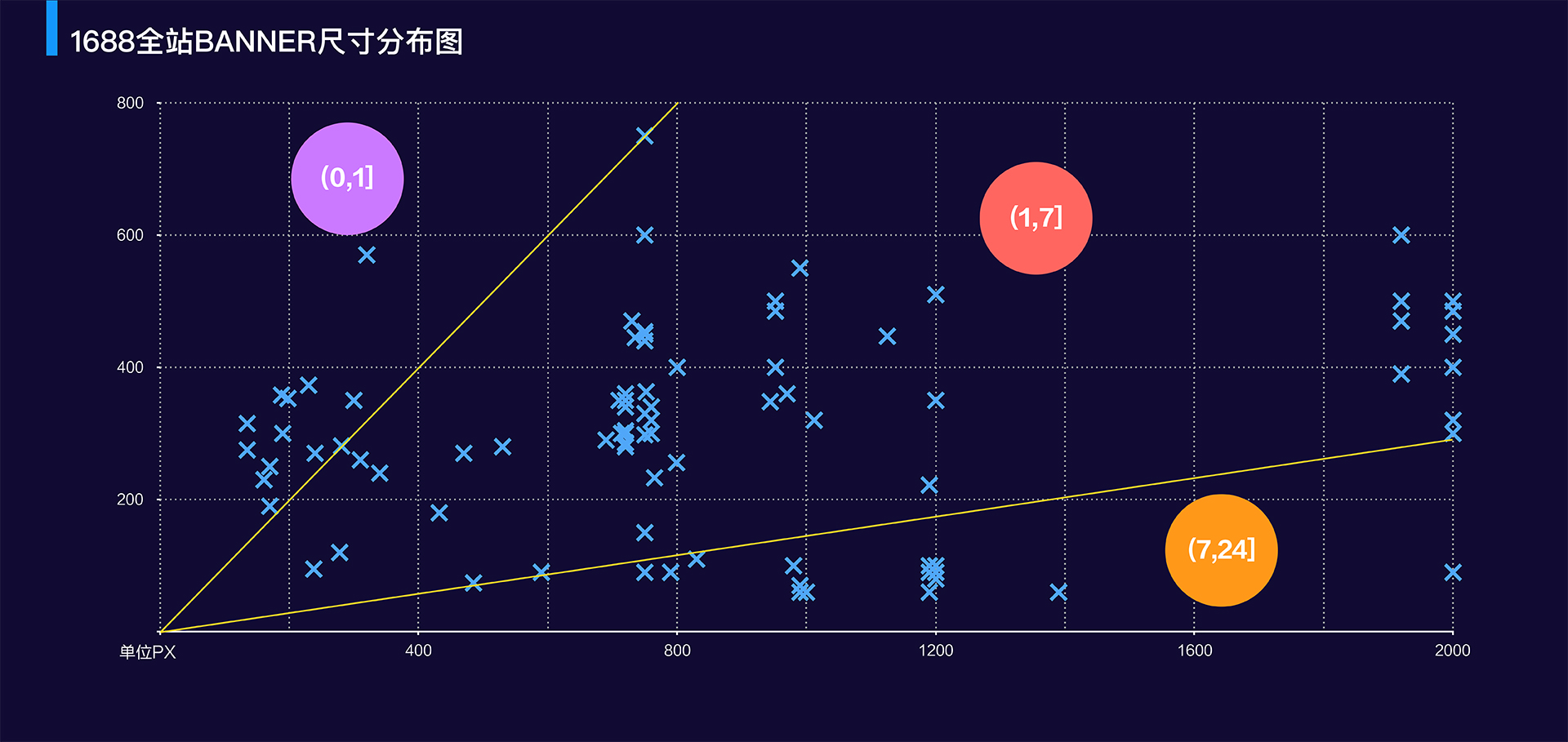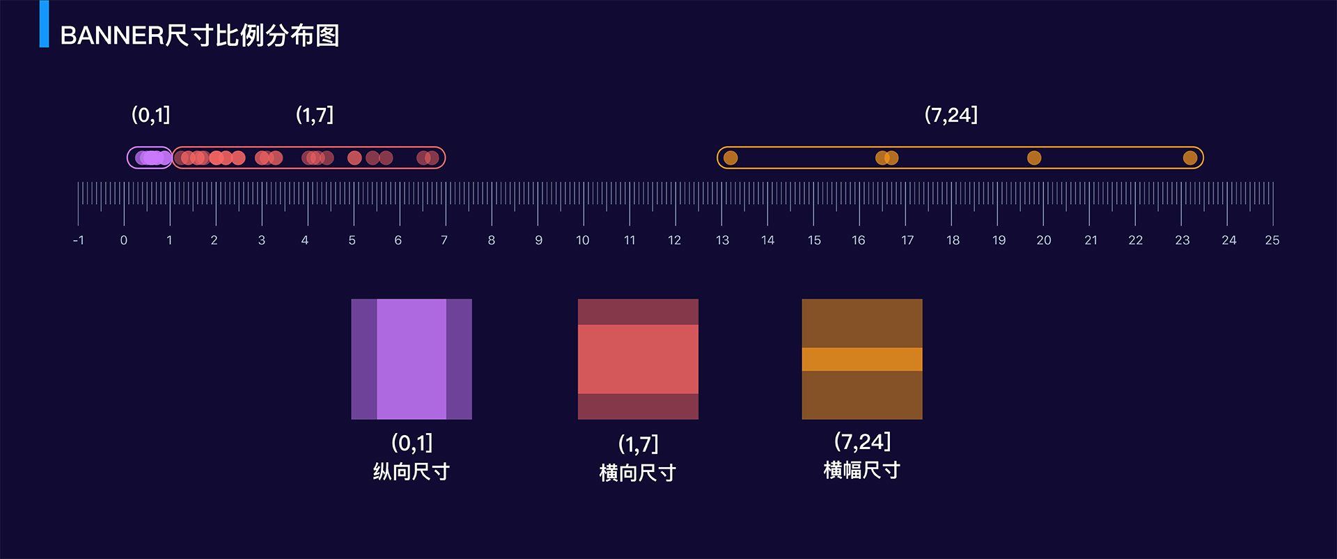 通过CBU日常营销1000余张banner的分析,我们发现其中80%以上在设计上采用左右结构,将此种结构的主模板作为优先解决的对象,降低机器处理的复杂程度。分析了现有站内90个+的营销尺寸,共计数千张banner,统计常用的尺寸比例。绘制尺寸比例的散点图,通过数据值的分布和数据点的分簇,将尺寸大致分为三大类,纵向尺寸、横向尺寸及横幅尺寸。