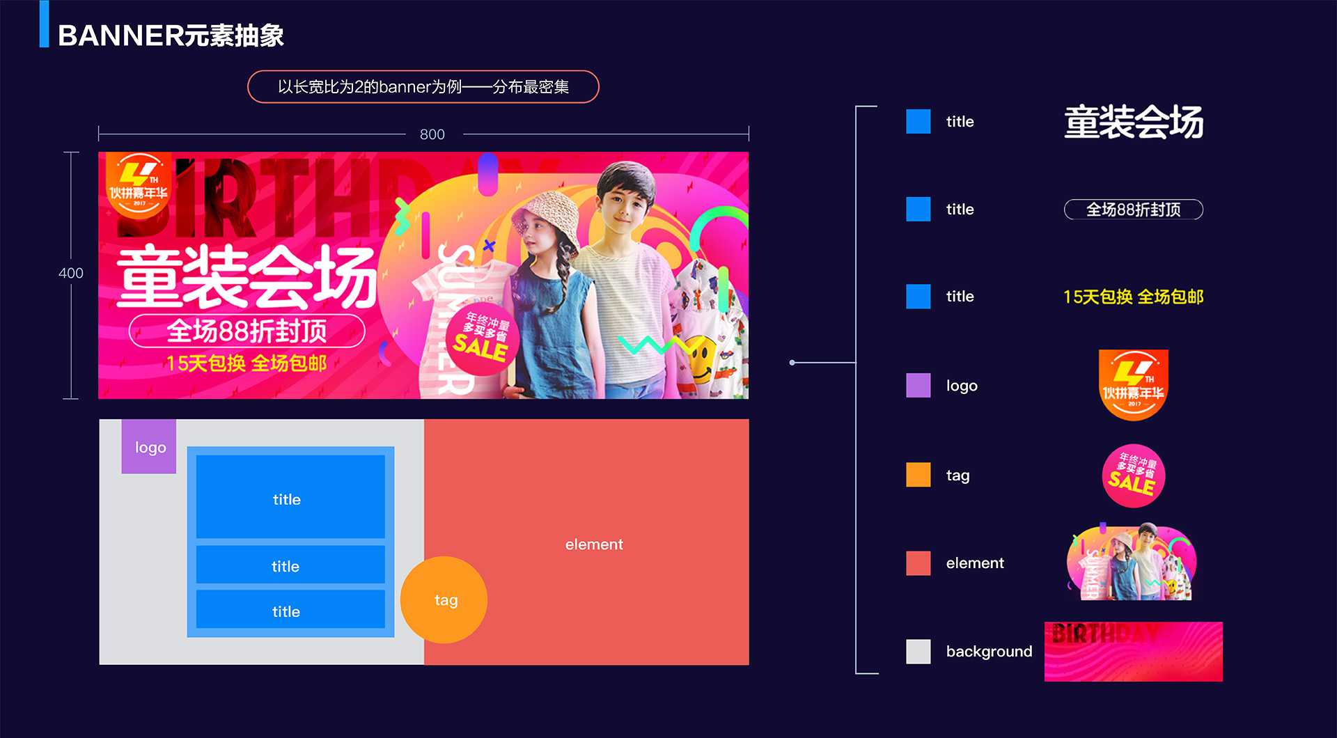 我们要将banner的版式特征提炼为可以量化的客观布局规则,首先将banner要素抽象为文本(title)、元素(element)、背景(background) 、标签(tag)及logo五大类,其中logo及tag为业务性元素,布局特征会随业务场景需要而有所变化。进而再确定各元素的大小、布局位置、尺寸比例和元素间关系,抽象其通用性布局。