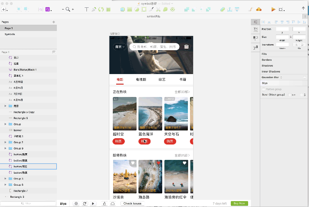 这个时候我们只需要在symbol里面把“预售”和“购票”这两个按钮做好,然后再页面基本设计完成之后,直接替换就可以了!