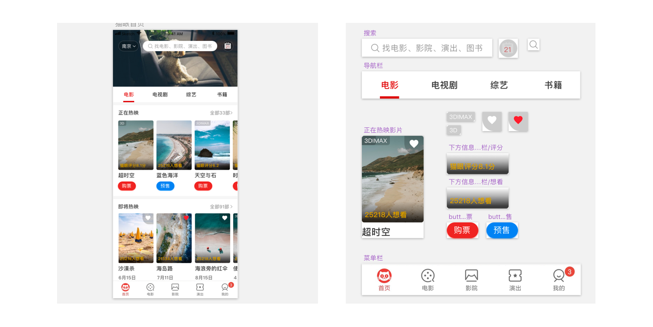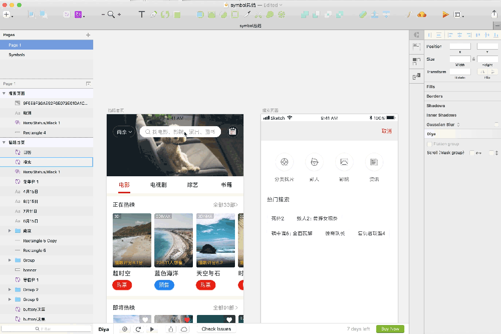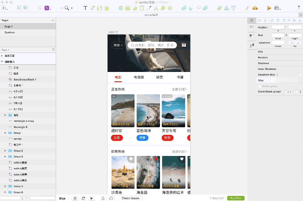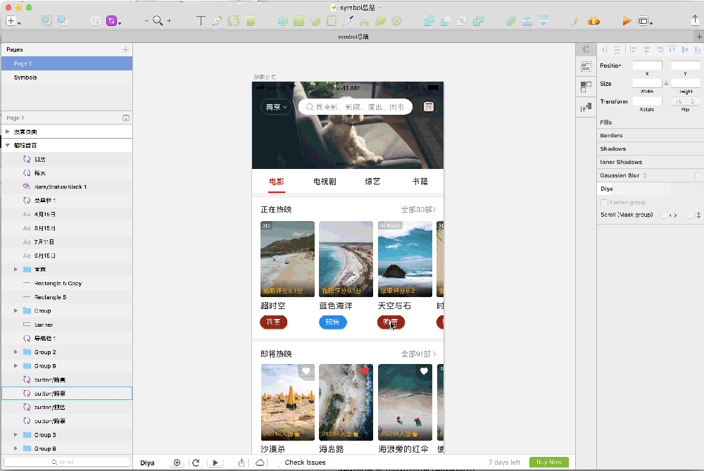 比如,这个页面中,每一部影片的模块都是一个symbol,影片上面的收藏按钮,影片类型(3D或者3DIMAX)、评分和多少人想看,也分别是一个symbol。这个时候我们只选择修需要改的影片模块,然后在sketch页面的右侧修改或替换对应的元素就可以,并且symbol里面的文字也是可以在右侧这个操作区中单独修改的。