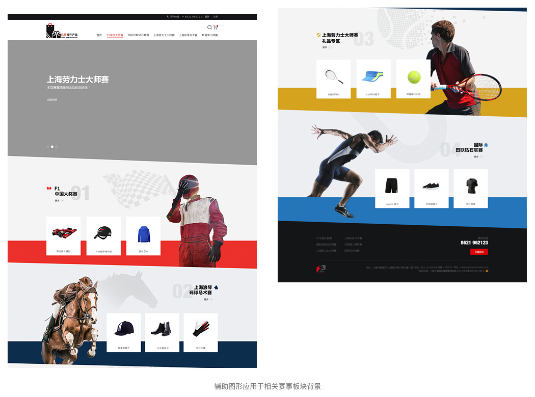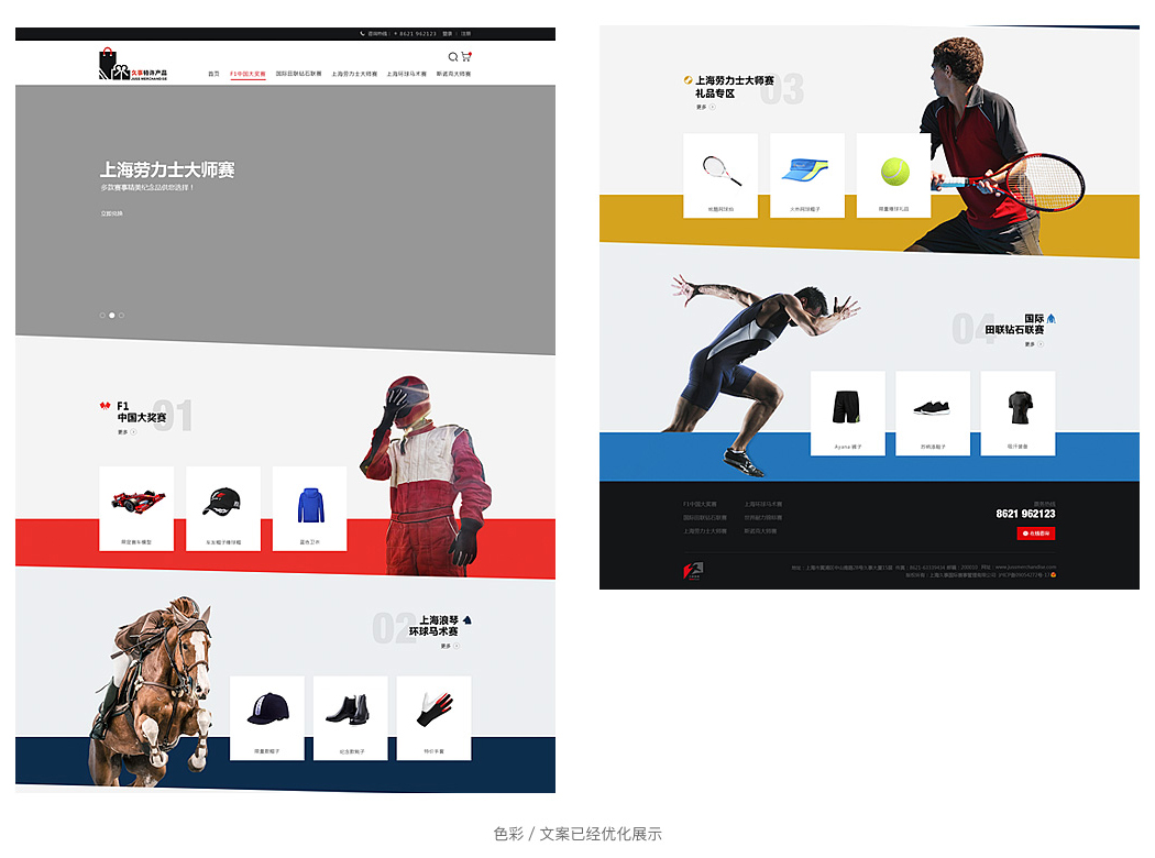 主要填充产品的图片/以及根据不同栏目赛事专区主题寻找相应的图片(找到的图片可以尝试先在板式上搭配下看看是否合适。再下载进一步处理。能让我们寻找的图片有效的进行适配。)于是我们先给网页框架填入客户提供的素材图片(下图是已经处理过后的图片)由于主视觉在整个页面占有比较重要的视觉。所以设计上相对用的时间比较多。为了避免浪费过多的时间从而导致项目延误。我们打算把整体设计完成后,最后来进行主视觉设计。