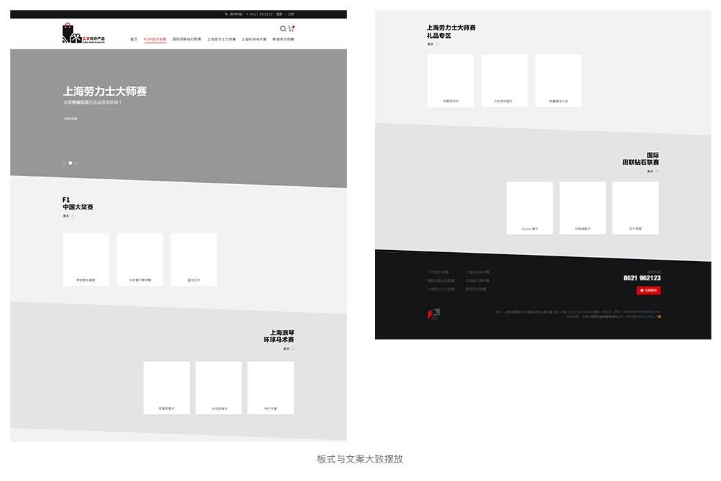使用软件将网页的内容规划,头部和底部保持原来不变/主视觉用于展示热门赛事等信息/内容区域展示不同赛事纪念品。呈现的时候尽量别去排版配色越简单越好(因为比较容易影响到后期设计配色等)或者使用文档的方式呈现。这个阶段主要把内容规划和客户或者产品经理达成一致。避免接下来设计因内容关系进行大的修改。