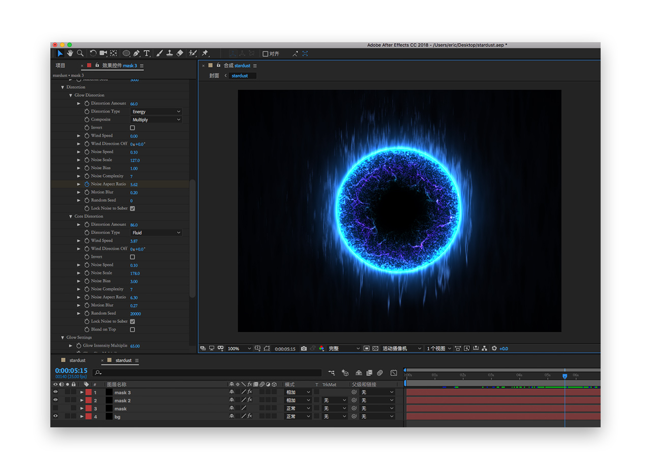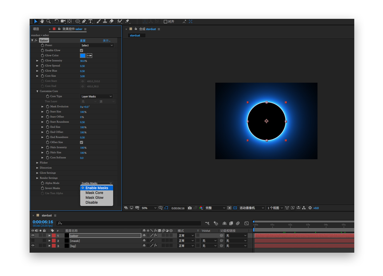 二十四. 改变光圈的颜色glow color为我们“黑洞”的相似色,同时将其图层模式改为屏幕,rander settings-alpha mode-mask core