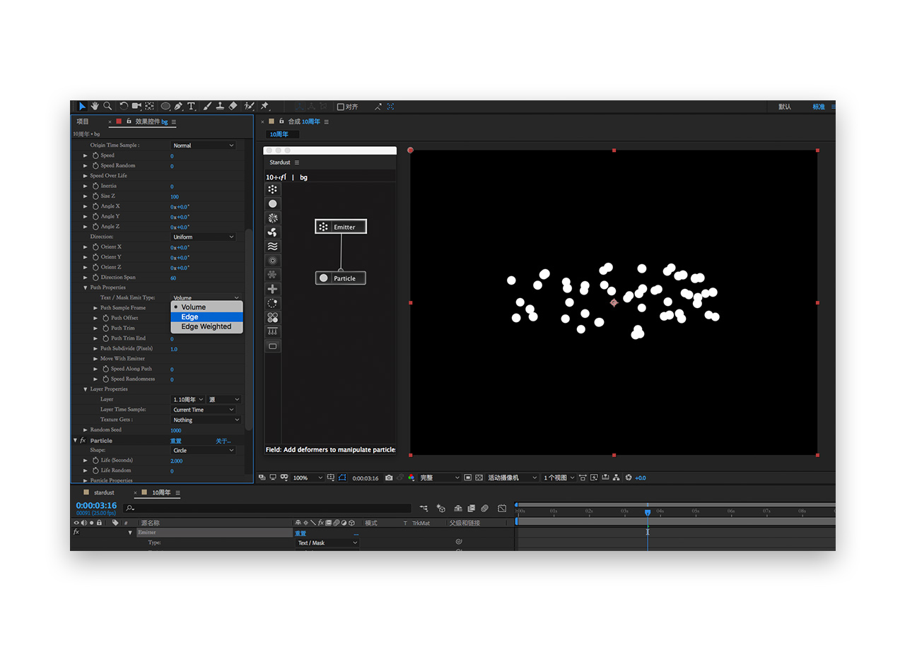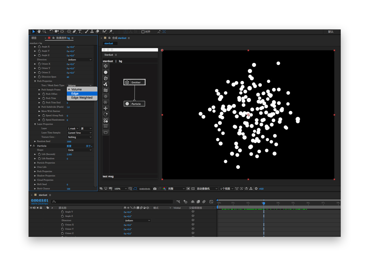 七. 此时会发现所有的粒子有内向外持续发射,我们需要将发射的形态修改为边缘发射path preperities-mask emitter type-edge