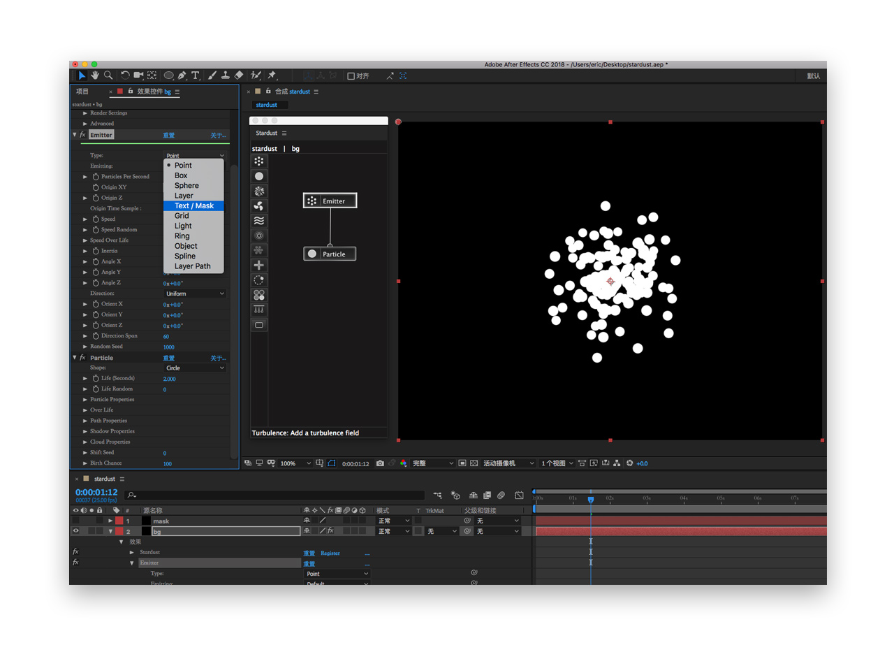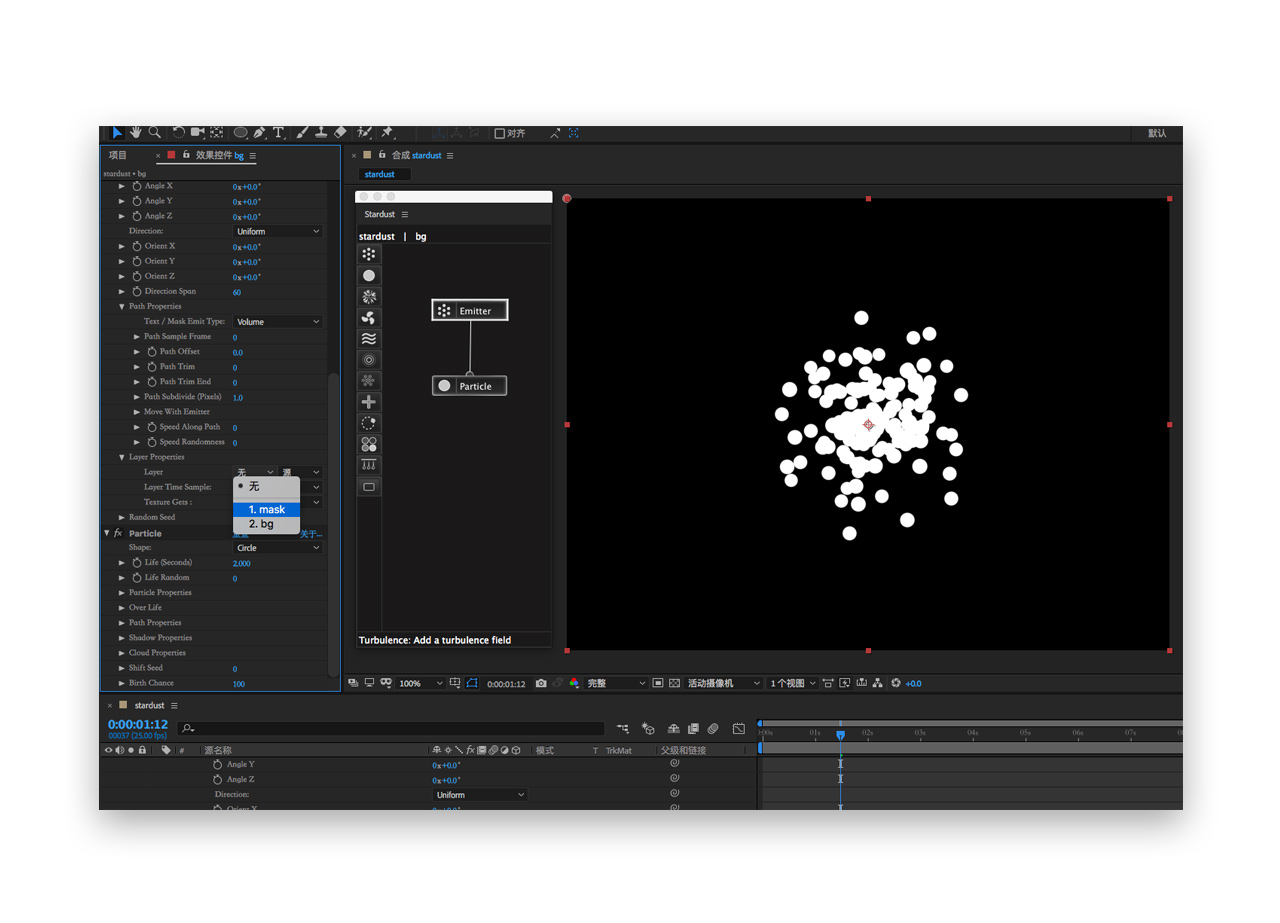 六. 回到bg图层,emitter发射器的type类型现改为text/mask,此时layer propertie功能被激活,定义图层来源为我们之前建好的mask图层。注意发射器的粒子speed速度需要改为0以确保所有的粒子不会脱离mask四处运动