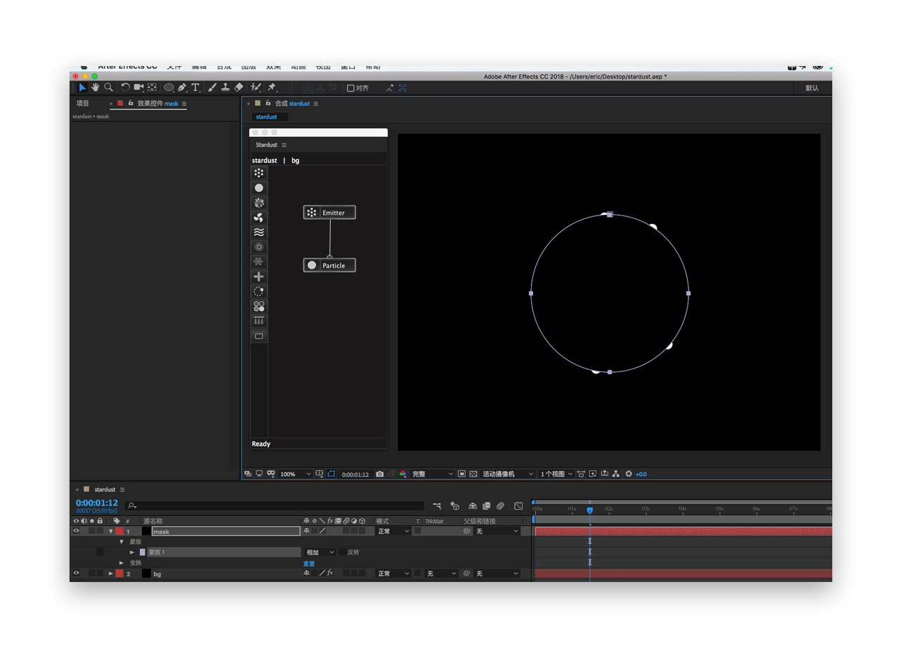 五. 新建mask固态纯色层,命名为mask,给图层添加一个圆形的蒙版,关闭mask图层的眼睛预览,以防我们查看粒子效果