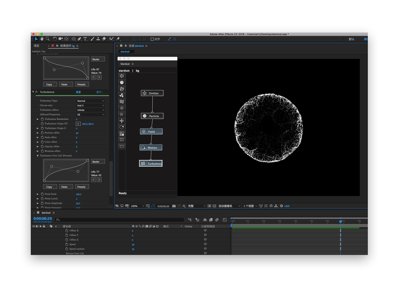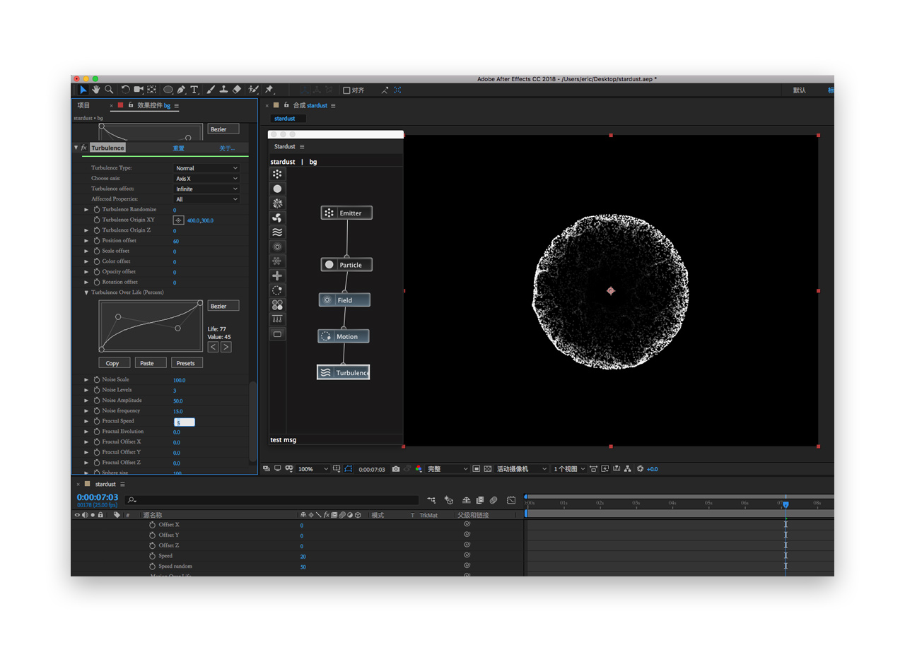 十六. 通过调节position offset参数使粒子不规则运动(但数值不宜太大哦不然就形变了),一样的需要调整turbulence over life的曲线,使粒子在产生后受扰乱场作用,可以适当调整下fractal speed使其速度产生变化