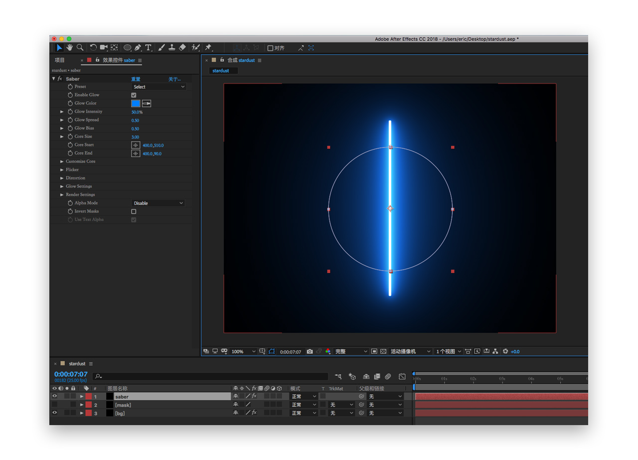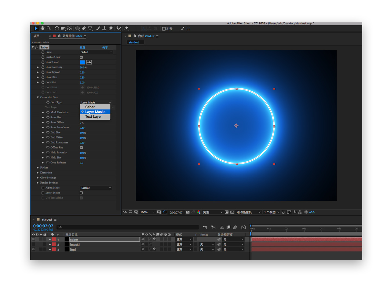 十八. 此时整个“黑洞吸附”效果就做好啦,我们需要打开新的插件saber,老铁们按要求先装好这款插件哦,在添加插件前,我们先将之前的mask图层复制一层命名为saber在复制层上添加,效果-video copilot-saber,这里就不细讲这款插件了之后的课程案例会专门分析一个光效插件的,目前只要了解他是一款光效插件,其预设自带的光效有几十种可以满足我们大部分使用场景