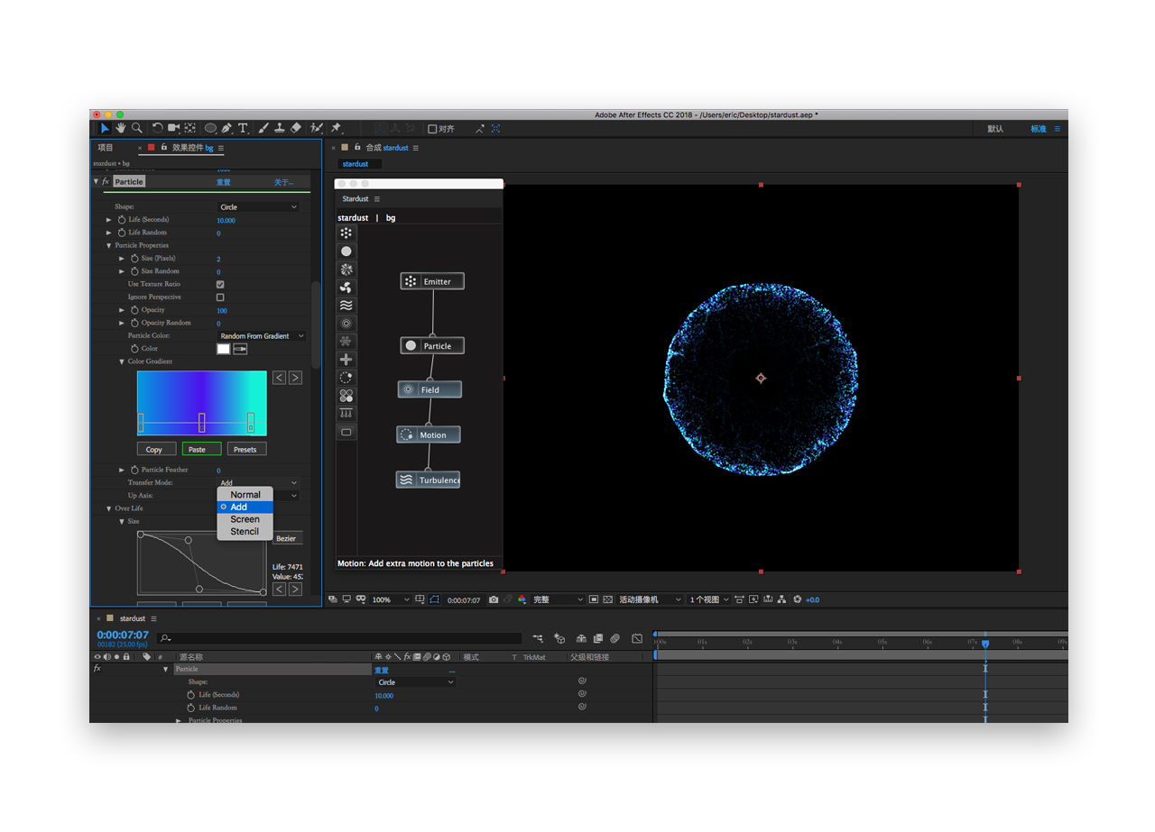 十七. 到这步整个粒子的节点部分就添加完了,现在我们需要做细节的调整,找到praticle节点改变粒子的颜色,stardust给我们提供了很多的颜色预设我们可以任意挑选,将transfer mode的模式改为叠加add,这是非常出效果的,让整体的颜色饱和度产生变化