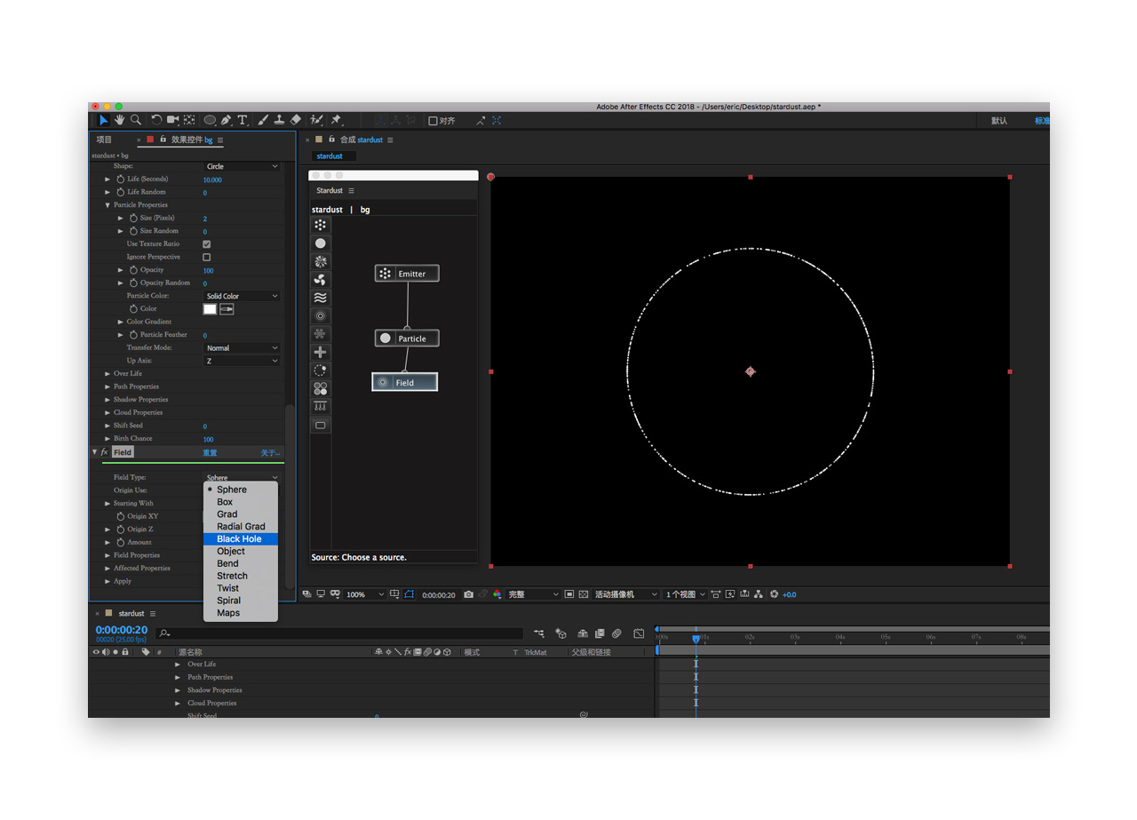 十一. 选中引力场节点将类型改为黑洞black hole,改完后会发现画布只显示一个白点,这是因为引力场的作用太大了,需要修改field properies-affect over life,通过调节曲线来改变引力场的作用力(可以简单的理解为粒子随寿命的增长而受引力场的作用力)