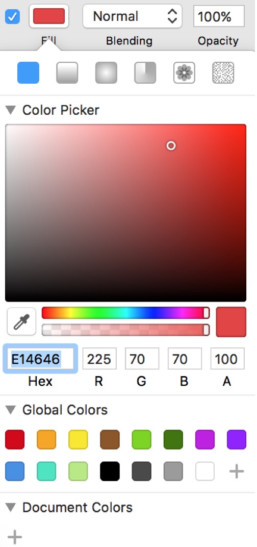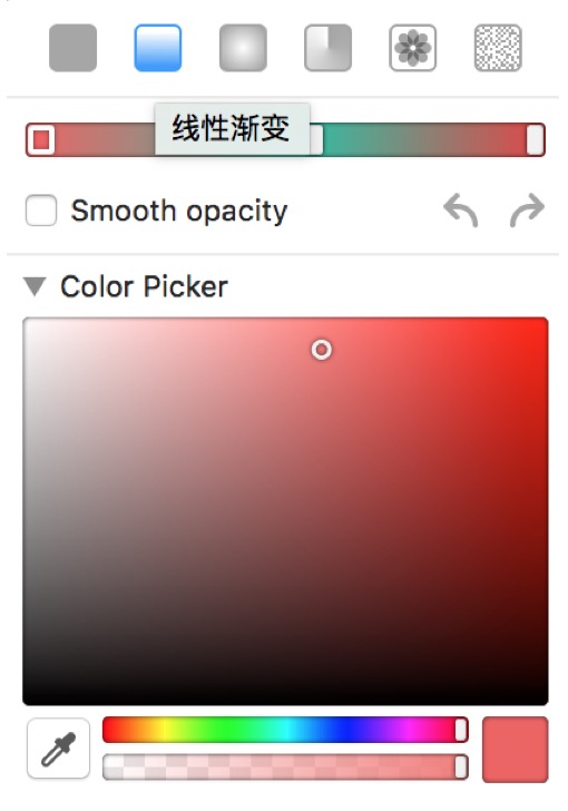 选择填充方式,从左到右侧依次是:纯色、线性渐变、径向渐变、角度渐变、图案填充、杂色