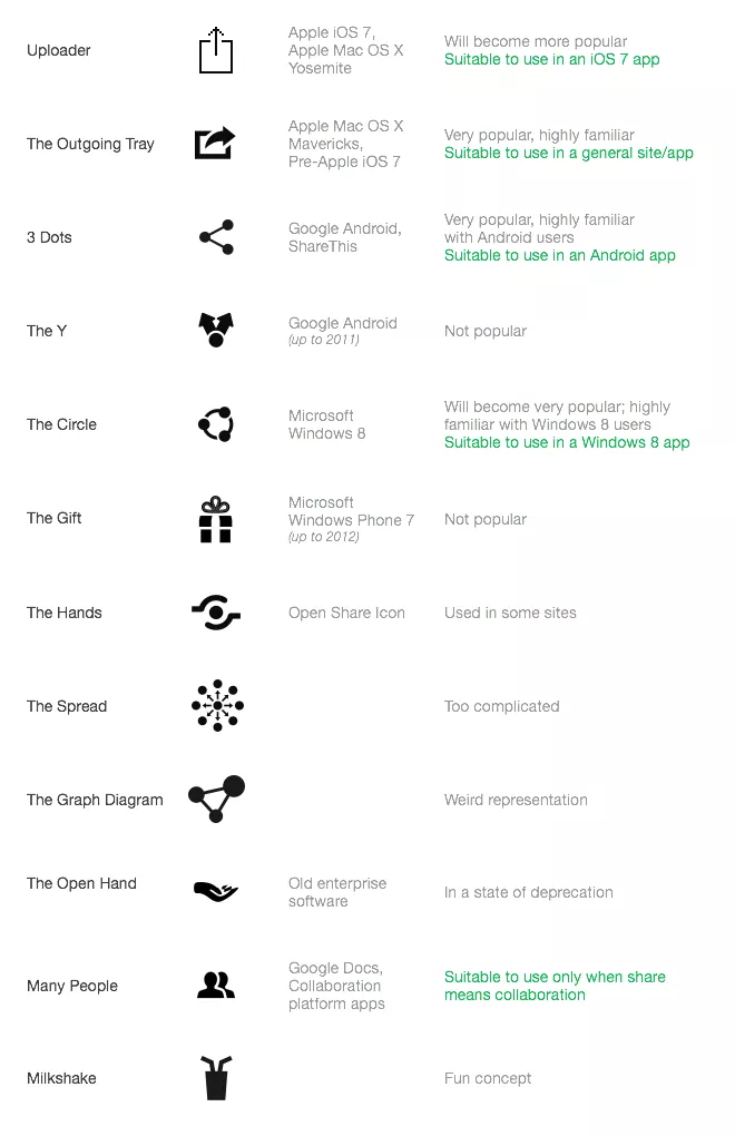 如何选用合适的多义图标呢? 比如上面的12种分享,简单来说就是选用户熟悉的。在做android应用的时候,分享使用android的三个点的图标,在做ios应用的时候使用ios的看似上传的图标,如果互换了,客户就迷惑了,不知道具体代表什么含义。