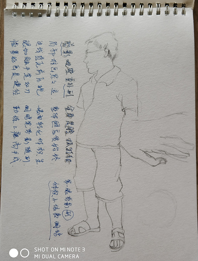 这是临摹的第一张速写,总算是稍微完整点了,左边是我记录的《于小冬讲速写》里的一些要点。“剪影观察重外形,全身是脸抓特征;局部推画紧紧追,整体照应贯始终;边线叠压前后现,坡面转化体积生;眼如触手笔如刀,明暗笔势影随形;临摹好画是捷径,勤练上瘾高手成。”