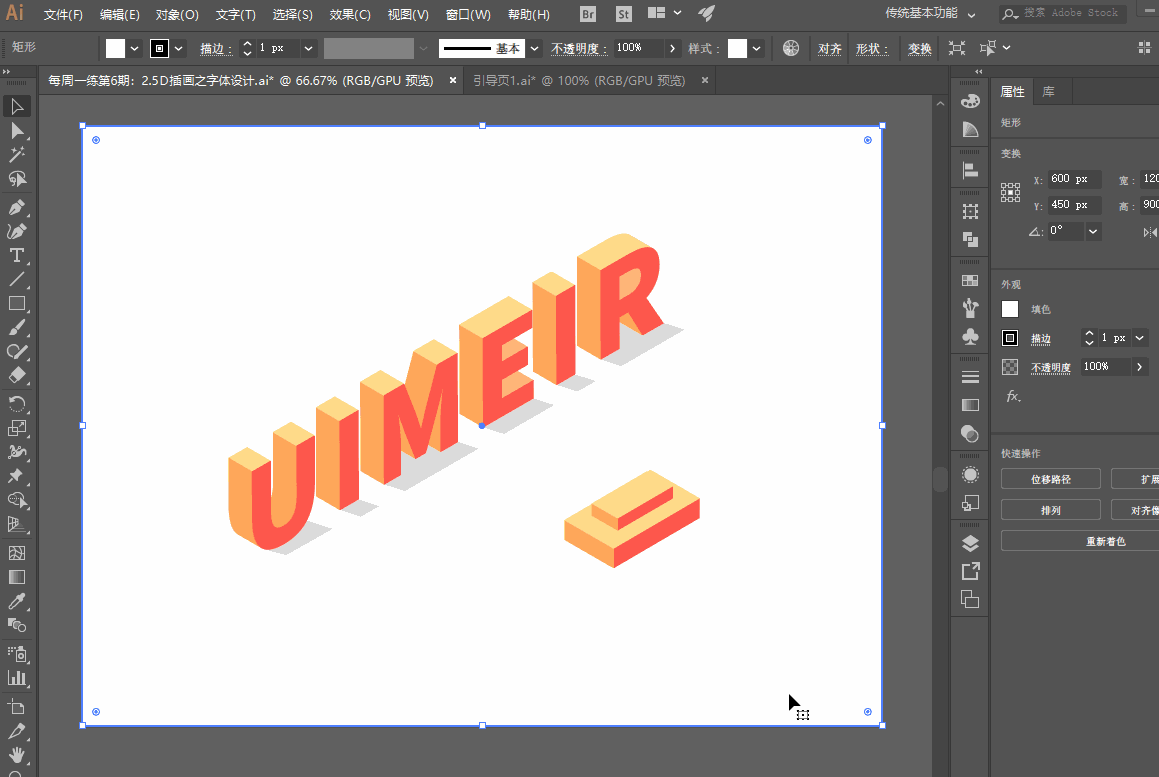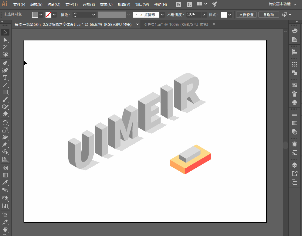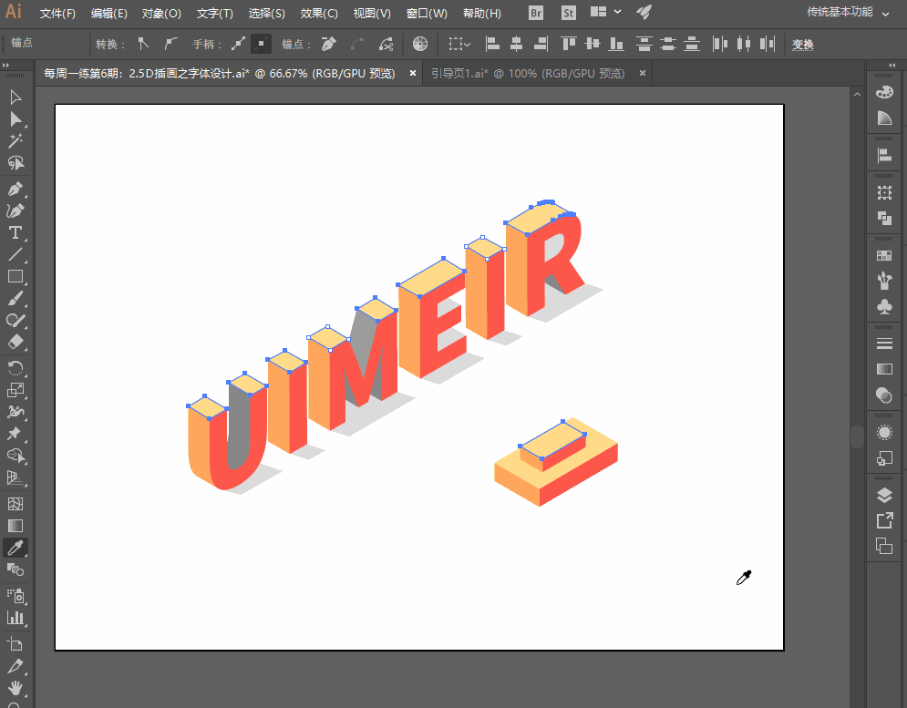 第10步:上色,用直接选择工具(白箭头)选取对应的面,我们可以先给长方体造型上色,左侧面色值:# ffa75c,右侧面色值:# fe574c,上面色值:# ffdc89,字母颜色,各面用吸管工具吸取长方体对应面颜色即可,目的是为了快速上色,如动图:
