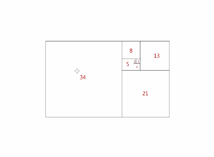 我们简单的来看,一个黄金矩形,可看做由一个编号34的正方形+一个长度一样、宽度是长度0.618的矩形组成,那么右侧的矩形是不是黄金矩形呢?答案是,是的!就是那么神奇,右侧矩形也是由一个编号21的正方形+个长度一样、宽度是长度0.618的矩形组成,以此类推.....有点绕口,多理解几遍