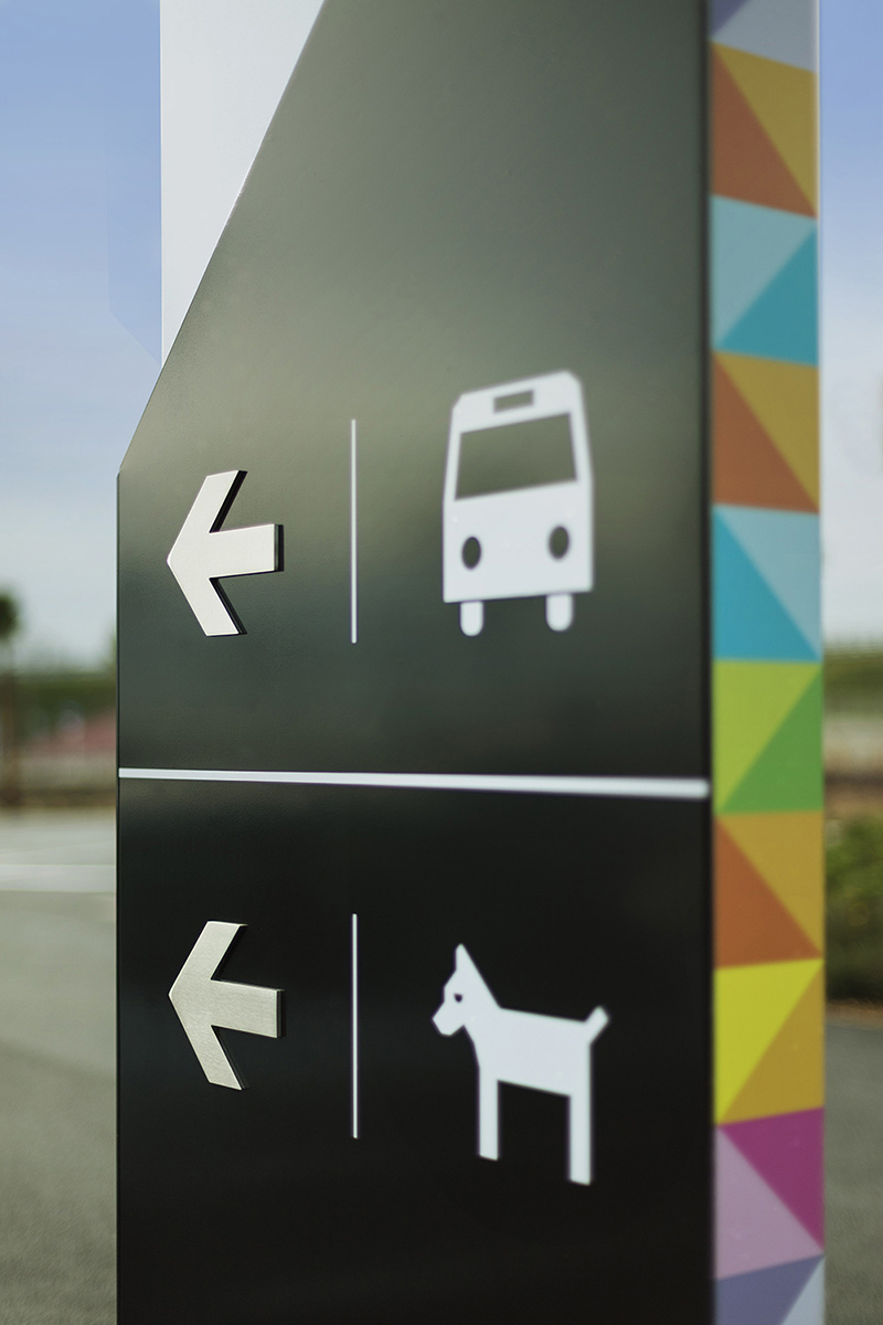 该项目的目的在于将标识系统和图形自然地融入到建筑空间中,为特定的指导需求提供解决方案。Mayúscula设计工作室基于现有视觉标识,将带有不同中心的色彩的三角形视为主要元素,并将其应用于所有的标牌系统设计中,使空间本身被作为展现品牌身份的一部分。导视系统采用不同类型的设置方式以及材质,但整体规模化的设计充满现代化和系统性,很大程度上提升了顾客购物体验效果和品牌形象。