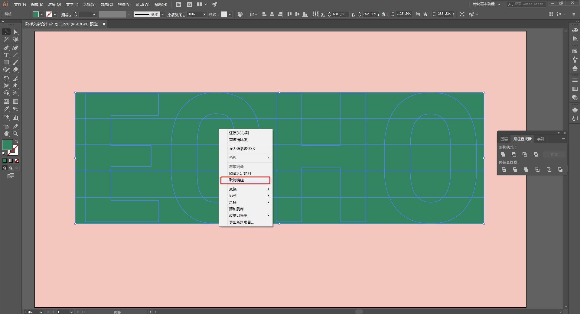 接着对对象进行取消编组,同样右键,选择“取消编组”命令,这样文字就分解成了单独的字母对象,不再是编组的一个整体了,可以单独对每个字母进行编辑操作。