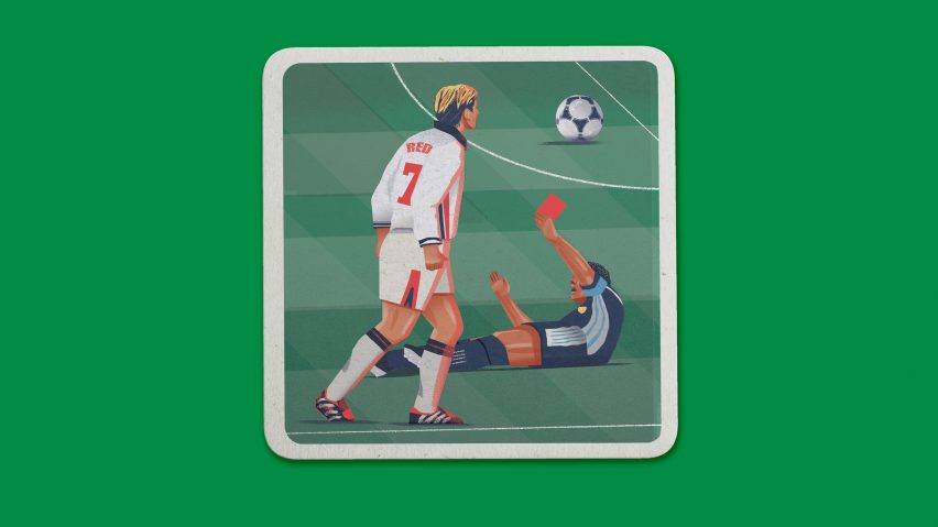 该系列啤酒垫上呈现出的是世界杯上那些有争议的进球时刻:其中包括1986年迭戈·马拉多纳的“上帝之手”式进球;1998年英国队对阿根廷队时裁判对贝克汉姆罚的那张著名红牌以及2006年齐达内一头撞向马特拉齐的瞬间。