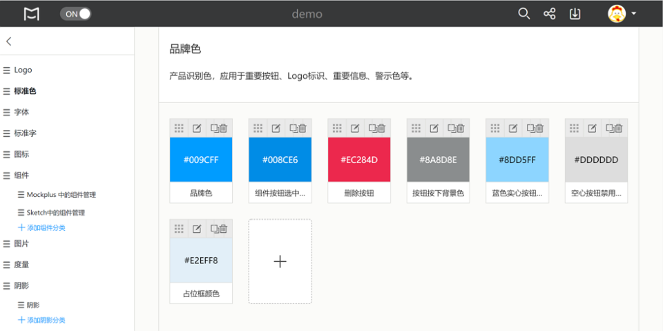制定良好设计规范的第一步就是合理归类。你需要先明确你需要整理的内容有哪些,这些内容的分类又该怎样呈现。比如在摹客设计系统中,你可以建立多个库、分类和子分类来进行管理,每个库里包含2大类资源分类,第一类是文件类资源,其包含Logo、图片、图标、组件、字体;第二类是编辑类资源,包括颜色、度量、标准字、阴影。基本满足了设计师的多种设计类型需求。