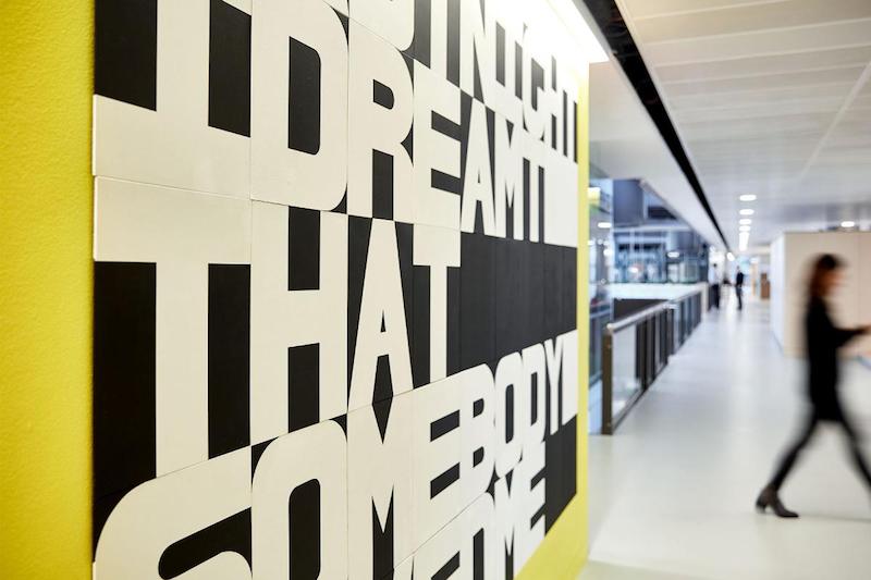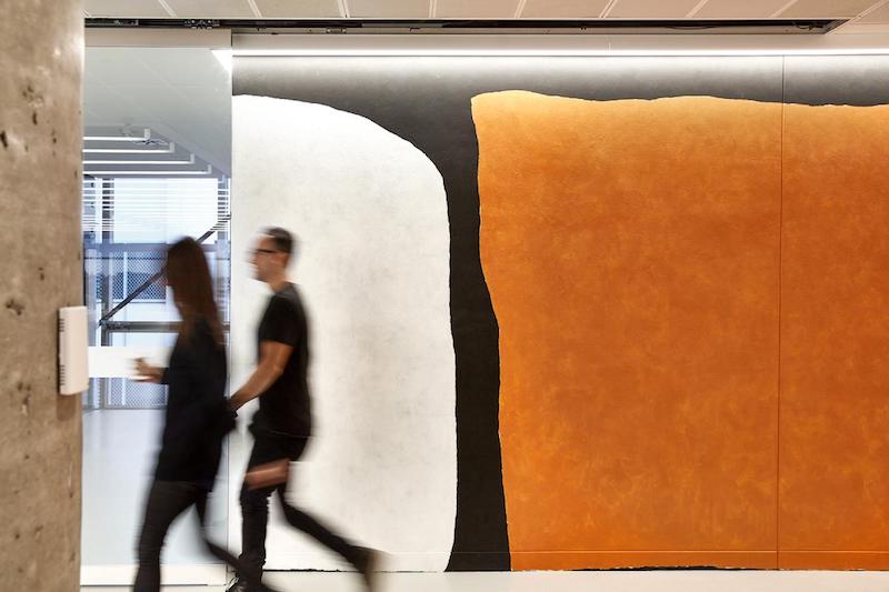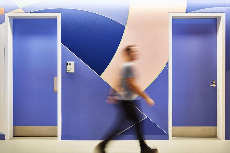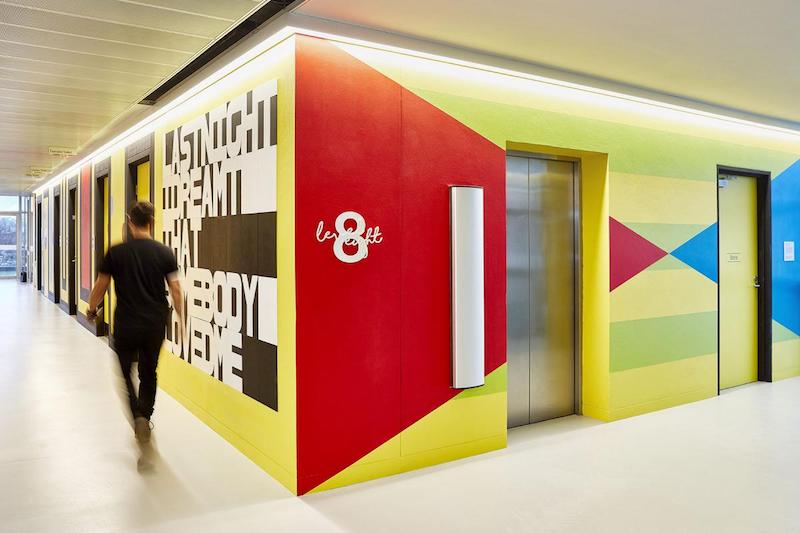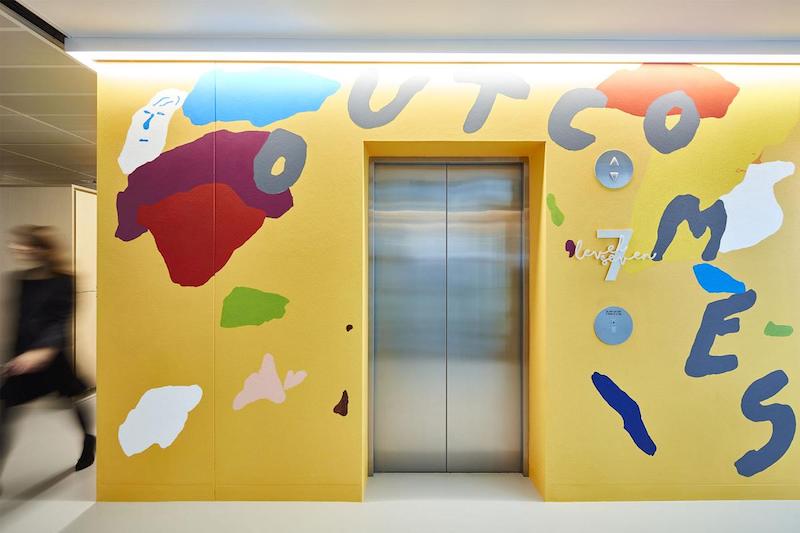 通过对该公司的研究,了解到罗氏在支持开创性艺术项目方面有着悠久的历史,因此委托四名当地艺术家进行“探索科学和艺术之间的相似之处“同时回应品牌价值为主题的超过25米的现场壁画作品。富有表现力的设计手绘应用于每个电梯大厅位置,大型图形成为导视的辅助元素,帮助工作人员在建筑内定位。以及高度可见的地标与分立标牌系统相结合,创造了清晰可辨的空间,既有助于导航,也培养了在开放式空间内工作的各部门之间的社区意识。