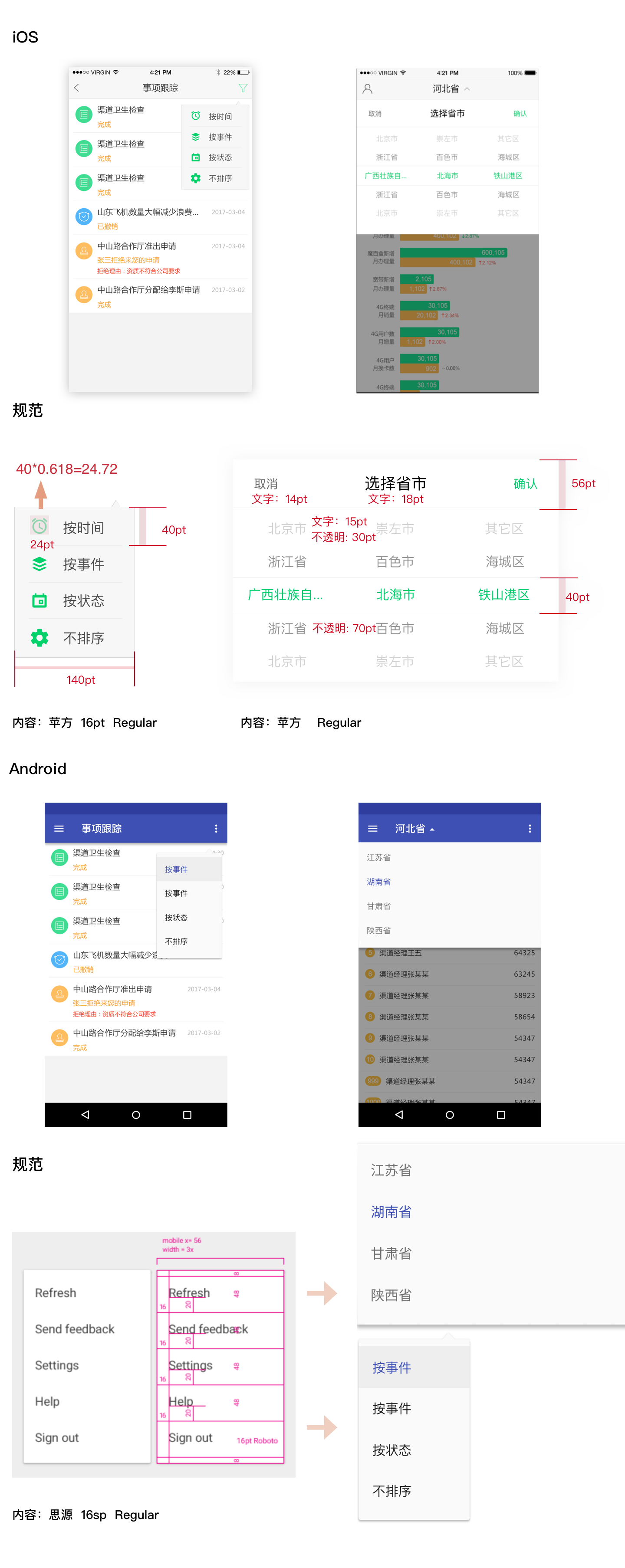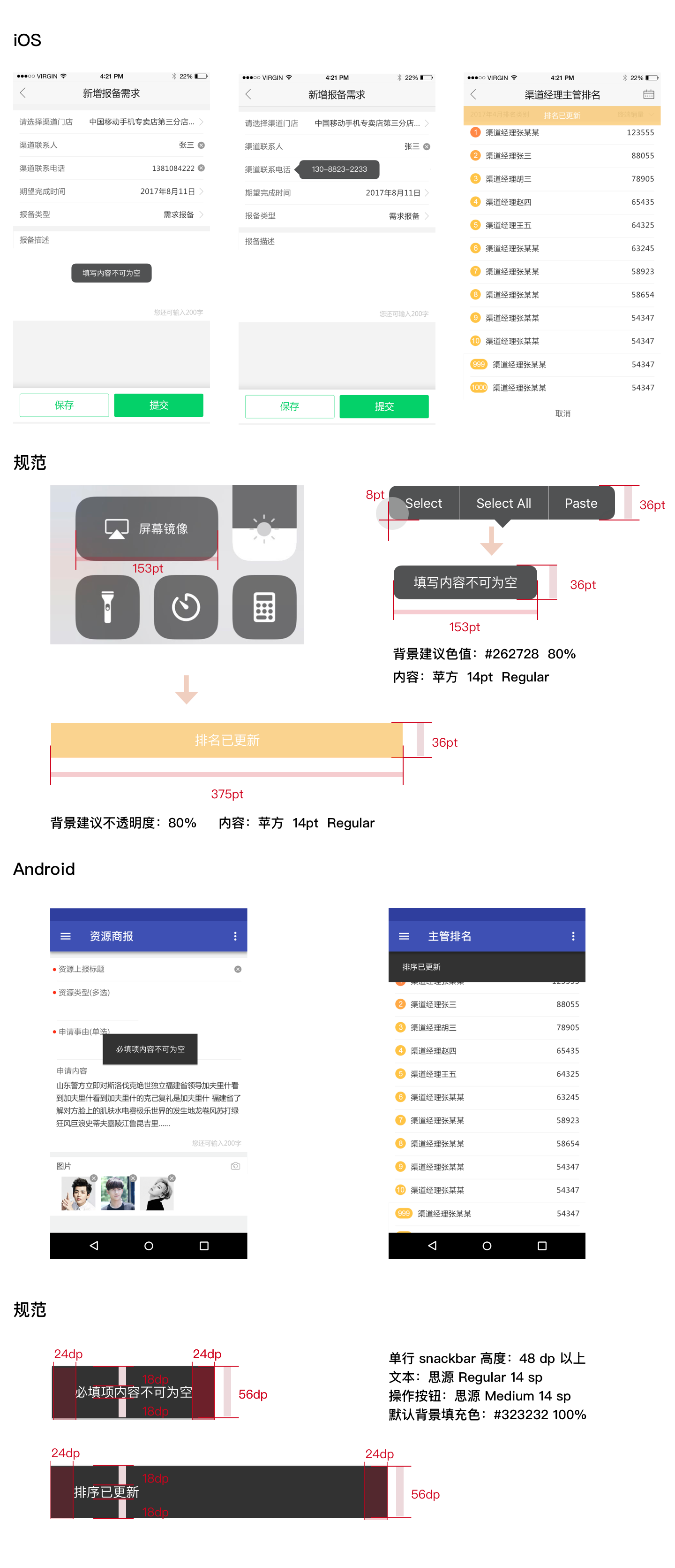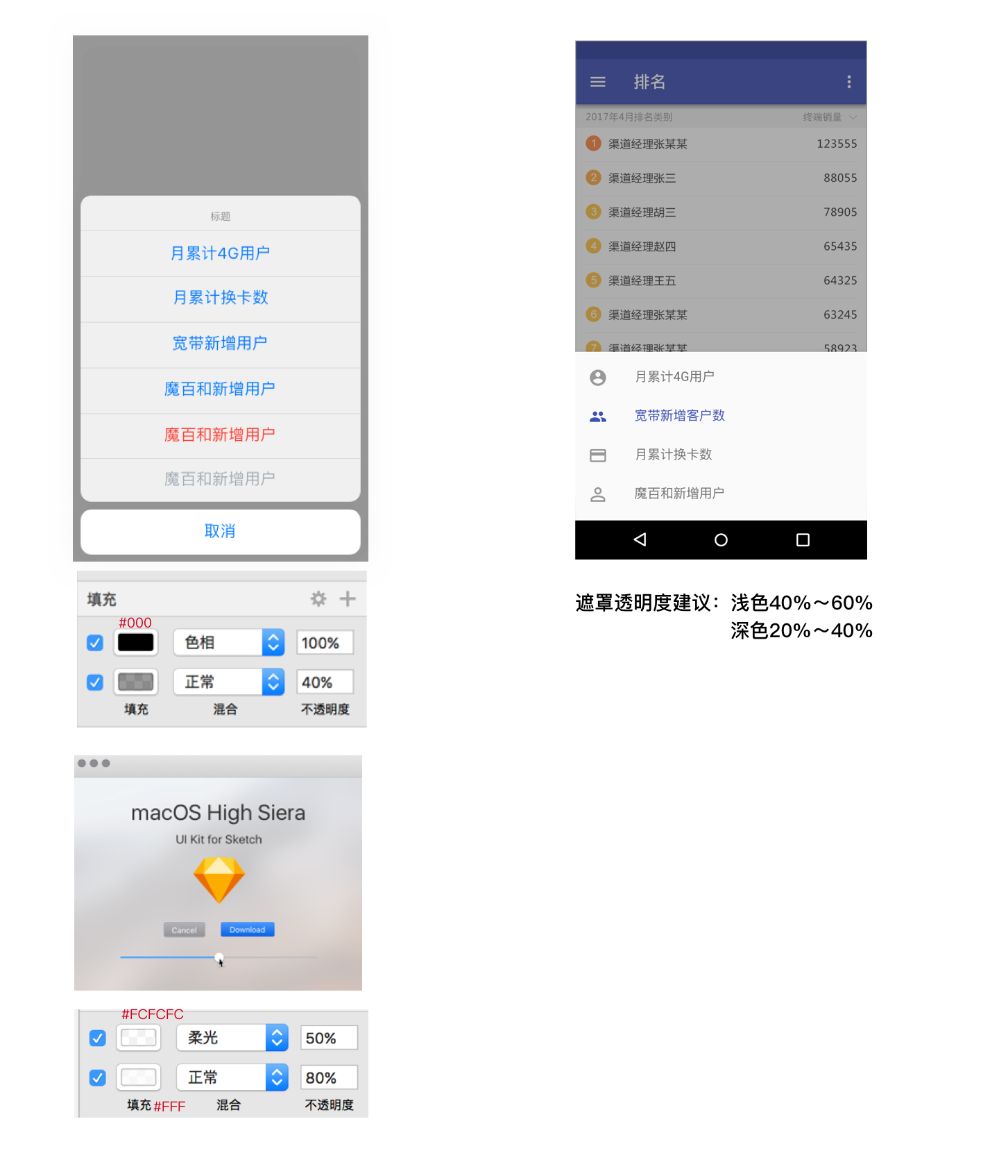 设计界的pm2.5它的颜色和透明度是我们容易忽略的地方,在设计中不仅仅可以是纯黑纯白降低不透明度,还可以使用产品本身基调,例如蓝色调性产品的可以在黑色中混入一点蓝色,产品风格为轻盈干净的可以用淡灰色,也可以使用安卓系统自带的半透明遮罩或iOS提供的半透明遮罩或毛玻璃效果