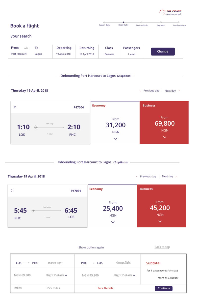 首先,每次付款都是在Air Peace网站上进行的。用户不必强迫自己选择付款方式 - 系统会为你自动选择。而现在,这些步骤已经减少到两个了。