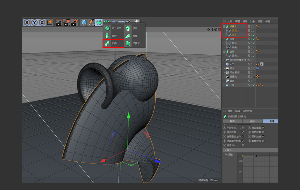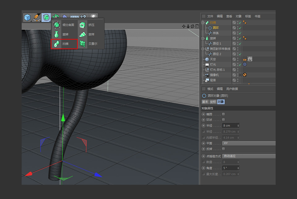 11. 新建一个扫描命令,使用圆环对刚刚画出的样条进行扫描,所得效果如下图所示(注意层级之间的关系)