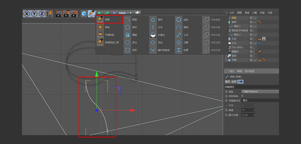 6. 选中旋转的样条,在红色方向的坐标中上面进行对样条位置的调整,调整后的效果如下图所示
