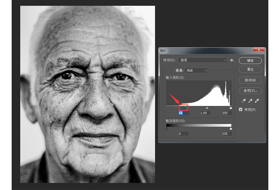 准备一张人物素材图,导入PS中,CTRL+L调出色阶命令,调整暗部色阶参数,让图像五官更佳明显。
