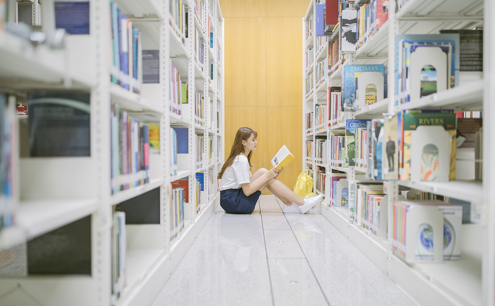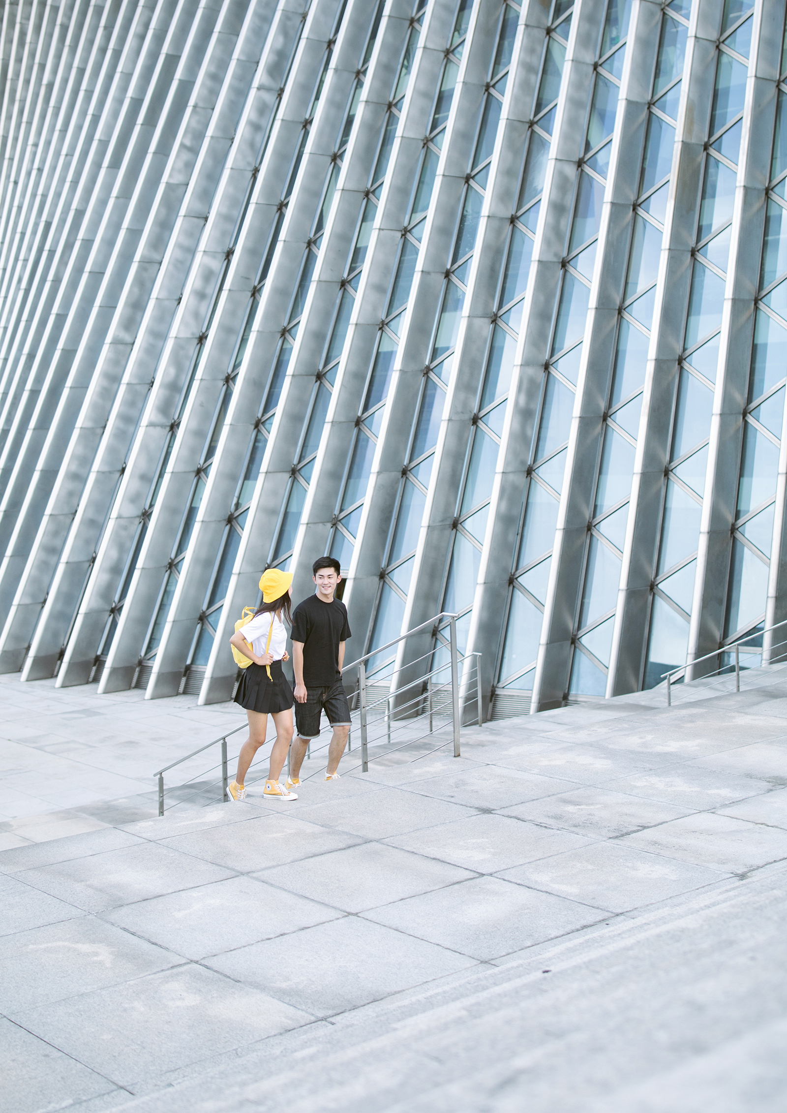 图书馆的场景一点也不陌生,许多电影都会在充满青春气息的书架旁取景。而深圳图书馆最受摄影师风靡的是馆内外极富现代感的建筑风格。深图新馆建筑由世界著名的日本建筑师矶崎新先生主持设计,和音乐厅一道构成深圳文化中心。对于这两个功能完全不同的建筑,矶崎新先生设计时力求在整体上找到统一。两个建筑的正立面都采用大规模的玻璃幕墙来表现统一。东西立面则风格截然不同的,分别为柔和的水幕和三维玻璃曲面与刚硬的垂直墙面。